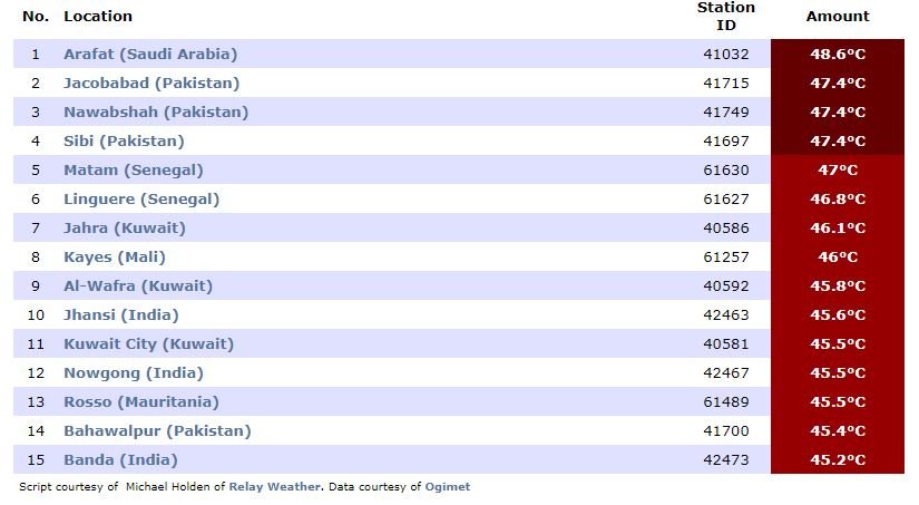 وتالياً ترتيب درجات الحرارة العظمى التي سُجلت عالمياً ليوم الاثنين 16/5/2022م:
