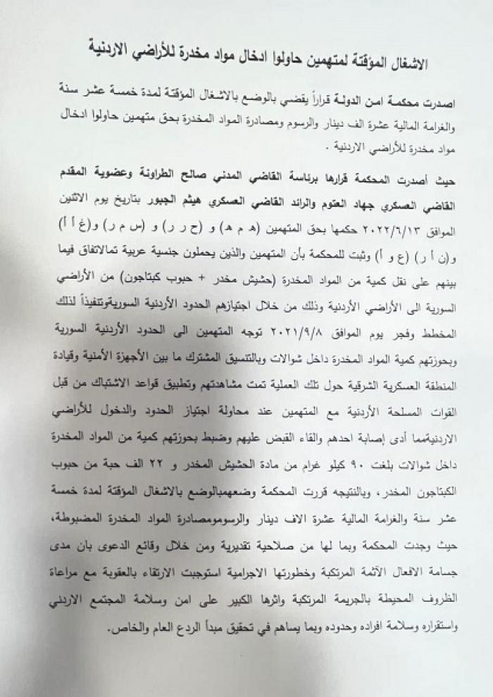 اصدرت محكمة امن الدول قرارا يقتضي بالوضع بالاشغال المؤقتة لمدة 15 سنة بالاضافة الى غرامة مالية عشرة الف دينار والروسم ومصادرة المواد المخدرة بحق متهمين بمحاولة ادخال مواد مخدرة الى الاراضي الاردنية .
