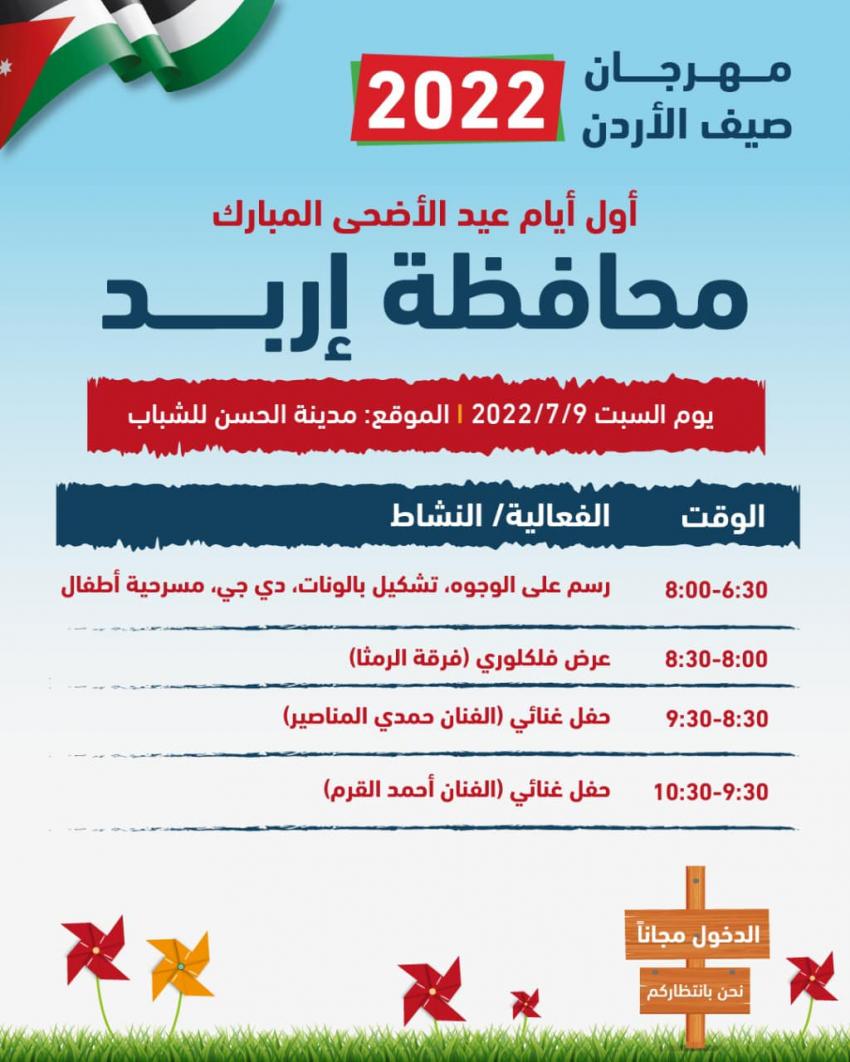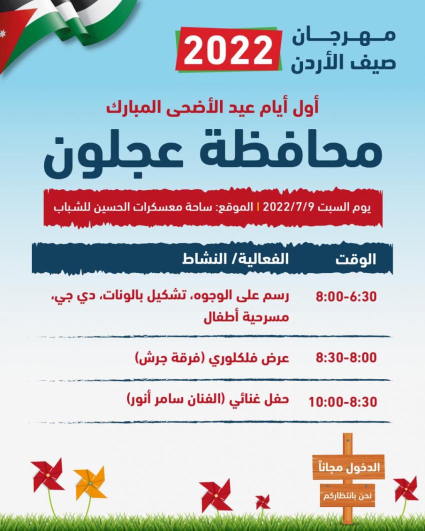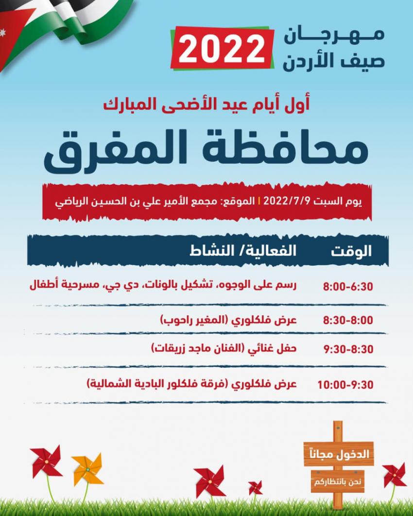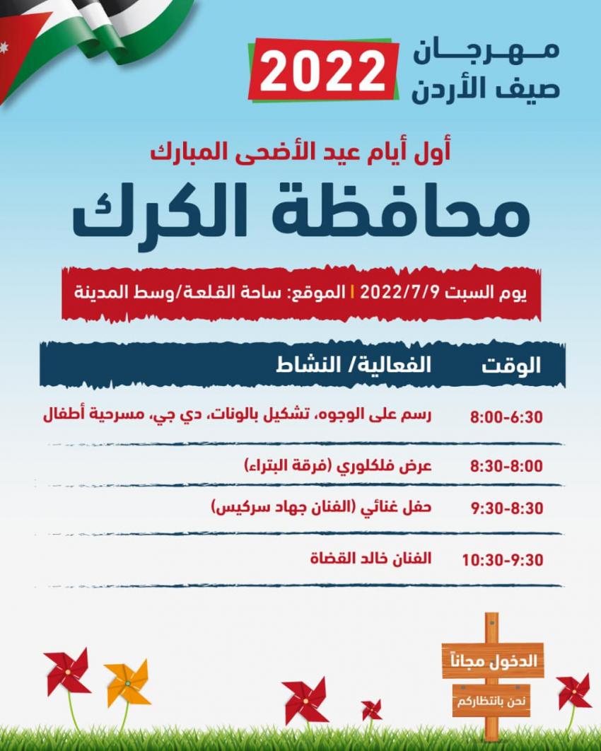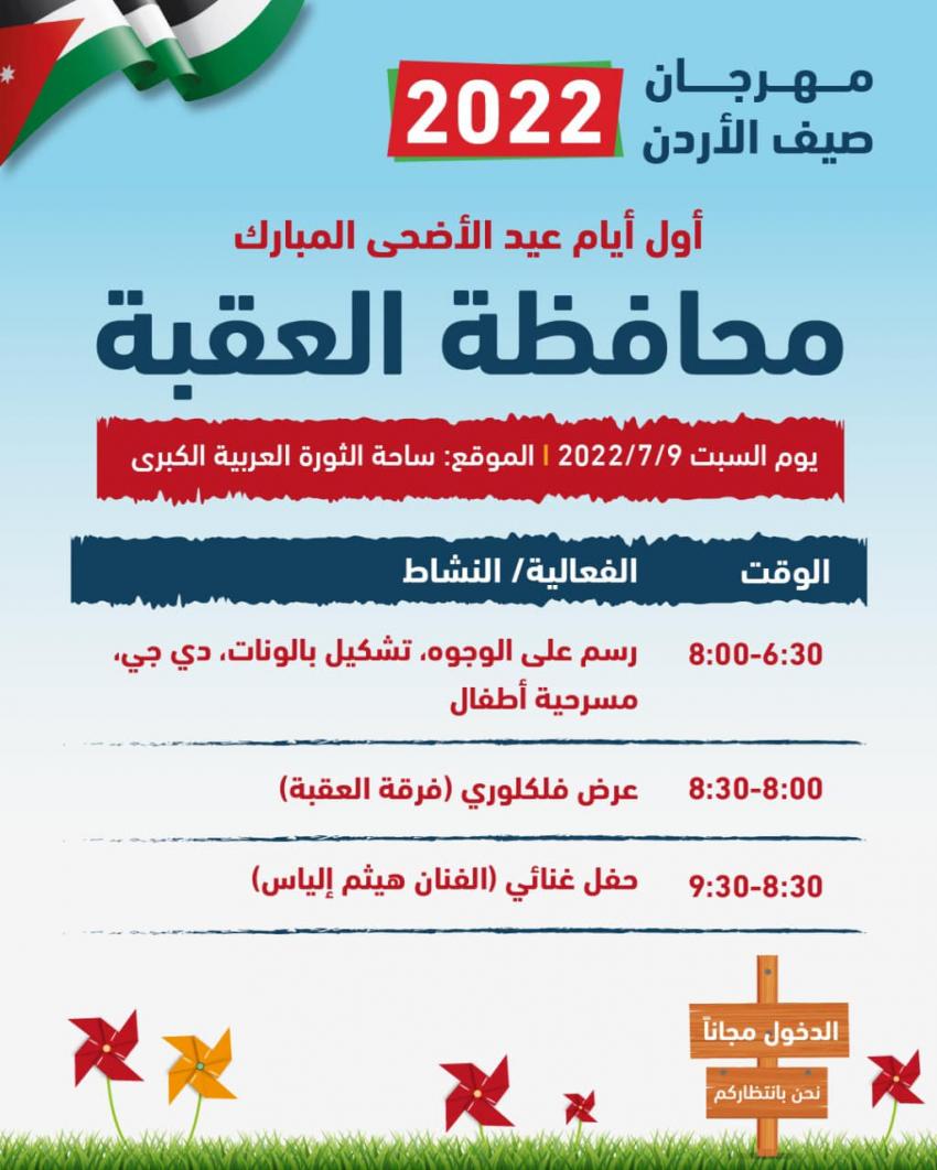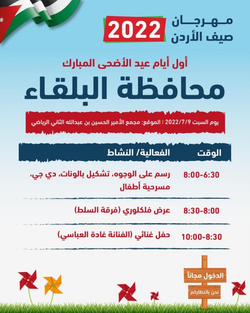 تبدأ فعاليات مهرجان "صيف الأردن 2022"، اليوم السبت أول أيام عيد الأضحى المبارك، في جميع محافظات المملكة.