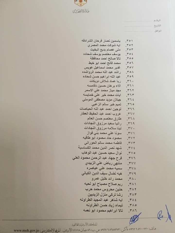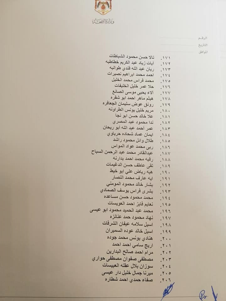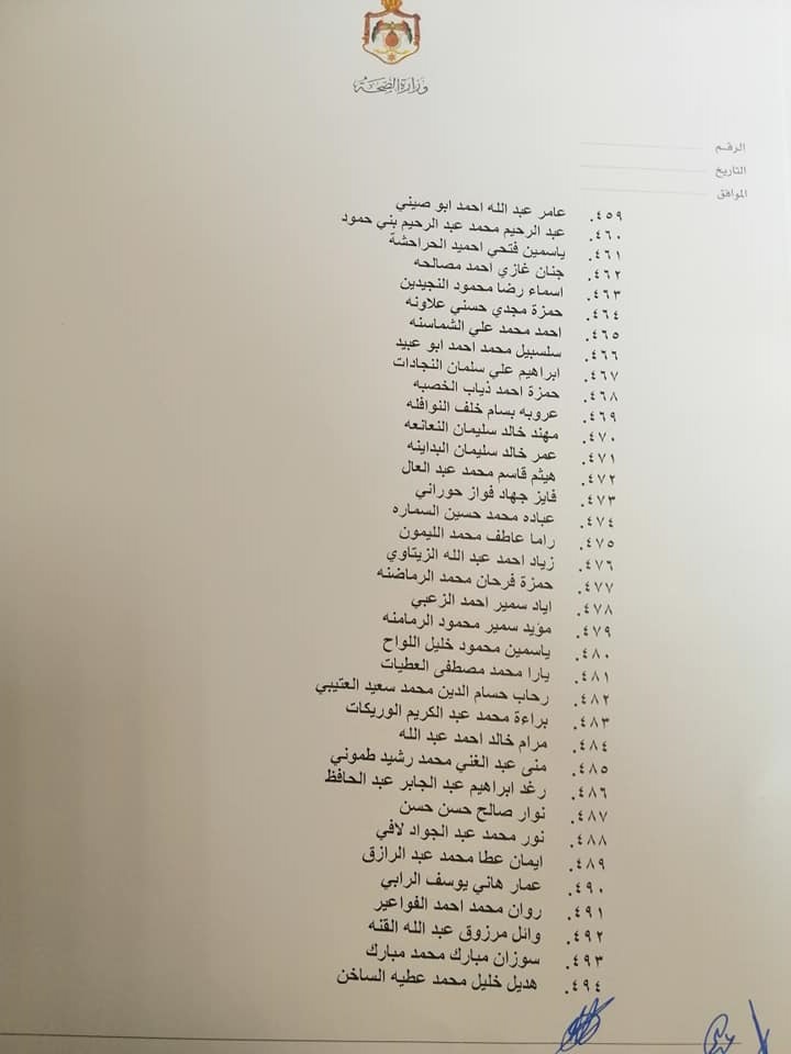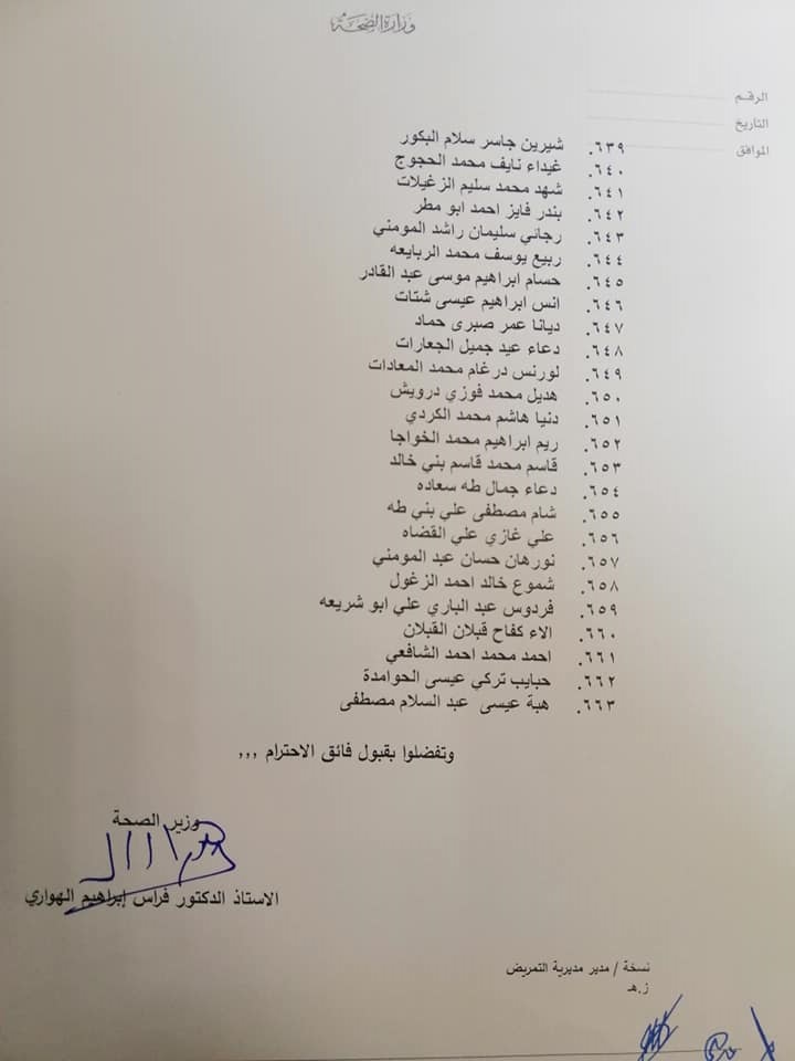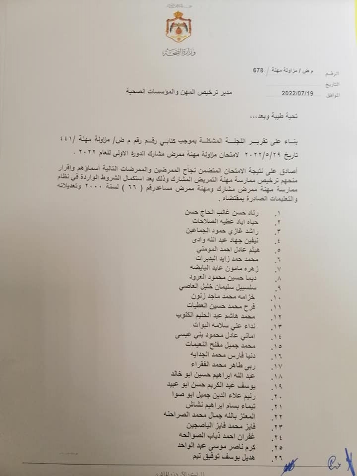 صادق وزير الصحة الدكتور فراس الهواري على نتيجة امتحان مزاولة مهنة ممرض مشارك للدورة الأولى لعام 2022.وقرر الهواري منح الناجحين ترخيص ممارسة مهنة التمريض المشارك وعددهم 663 ممرض وممرضة.وتاليا الأسماء: