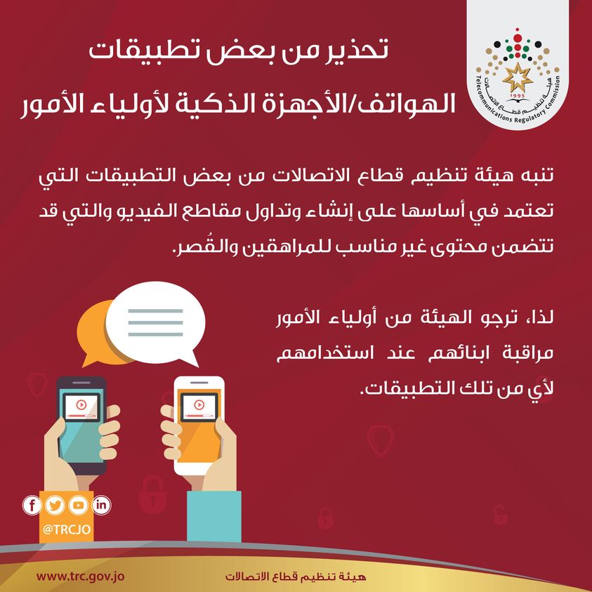 حذرت هيئة تنظيم قطاع الاتصالات، أولياء الأمور من بعض تطبيقات الهواتف الذكية المنتشرة في الأردن.