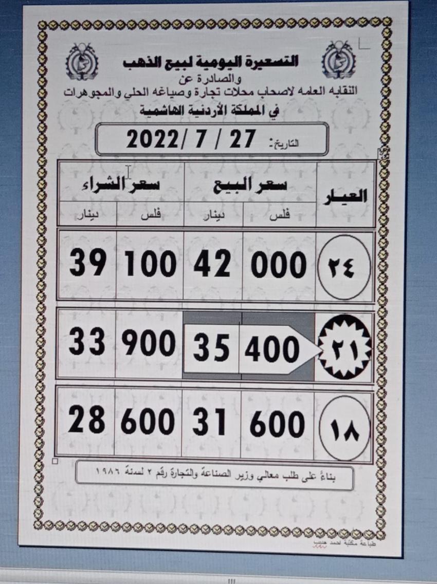 وبلغ سعر غرام الذهب عيار 21 الأكثر طلبا في السوق المحلي 35.40 دينارا لجهة الشراء و 33.90 لجهة البيع.