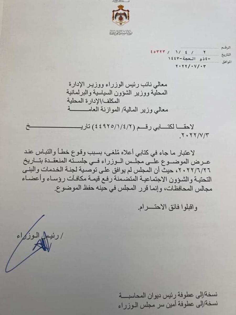 مجلس الوزراء لم يوافق على زيادة مكافات رؤساء واعضاء مجالس المحافظات والغي الكتاب في حينه وحفظ الكتاب وما يتم تداوله عار عن الصحه .
