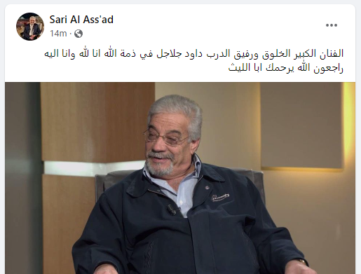نشر نقيب الفنانين السابق ساري الأسعد عبر صفحته على الفيسبوك خبراً نعى فيه الفنان الكبير داود جلاجل.وقال الأسعد : “الفنان الكبير الخلوق ورفيق الدرب داود جلاجل في ذمة الله انا لله وانا اليه راجعون الله يرحمك ابا الليث”