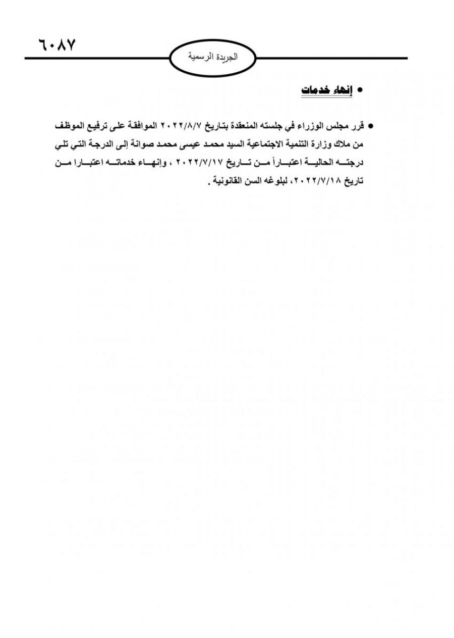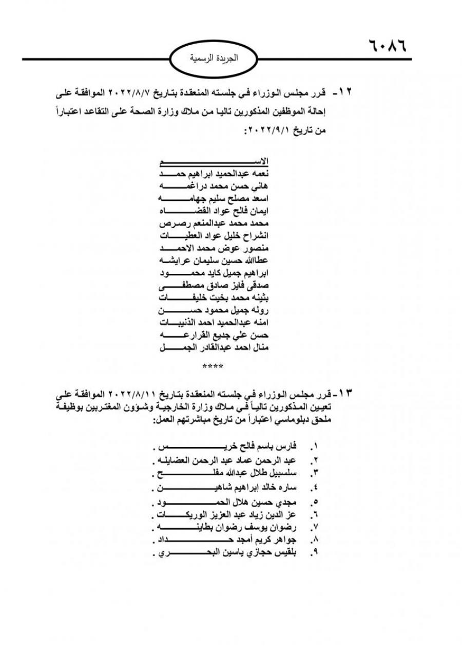 صدر في عدد الجريدة الرسمية اليوم الثلاثاء قرارت مجلس الوزراء بالموافقة على إحالة عدد من موظفي الدولة إلى التقاعد.وتاليا الاسماء:
