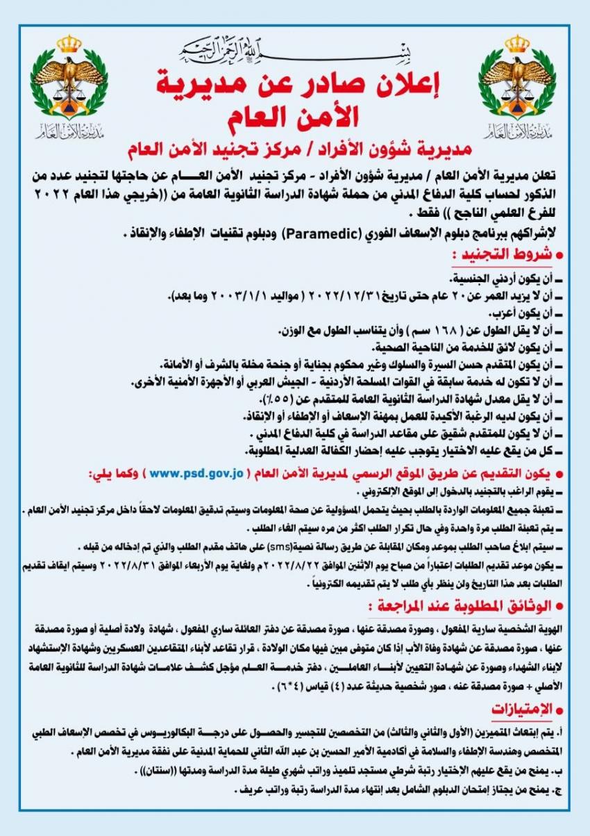 أعلنت مديرية الأمن العام الخميس، عن حاجتها لتجنيد عدد من الذكور لحساب كلية الدفاع المدني، من حملة شهادة الدراسة الثانوية العامة (التوجيهي)، من خريجي هذا العام (2022) وحسب الإعلان المرفق.