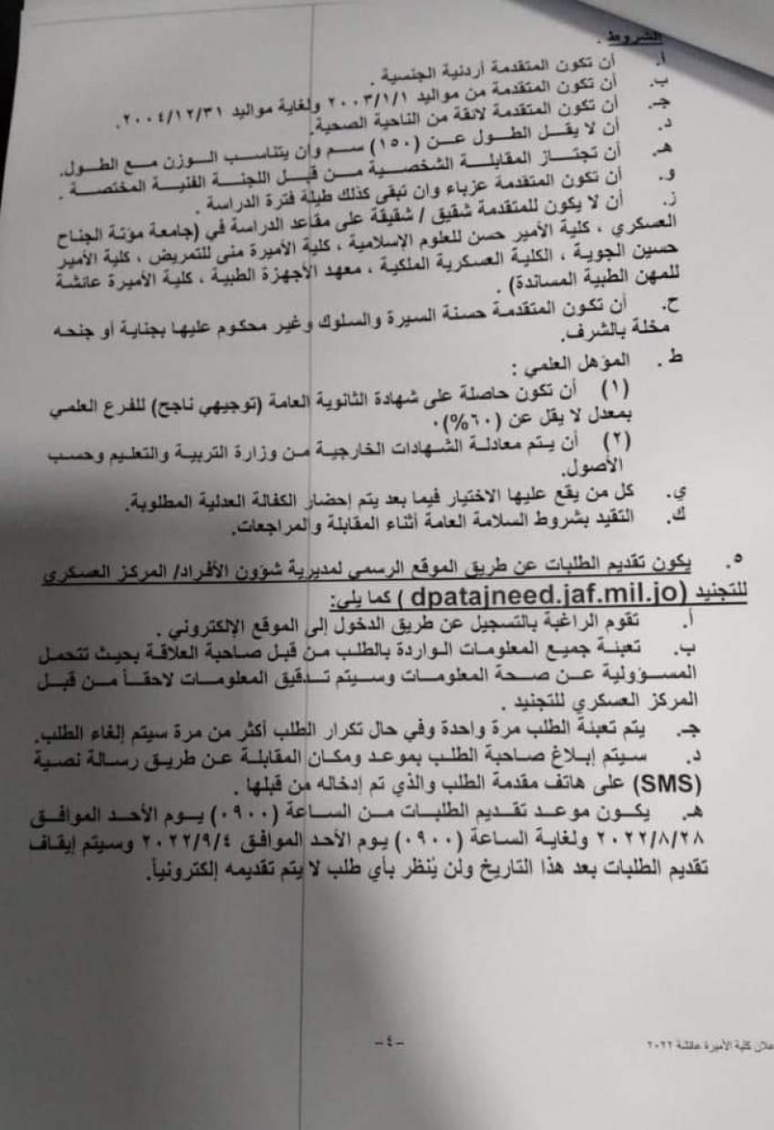 وعلى الراغبات بالتسجيل التقدم إلكترونياً من خلال الموقع الرسمي الخاص بمديرية شؤون الأفراد /المركز العسكري للتجنيد (dpatajneed.jaf.mil.jo) والـذي سيتم تفعيلـه مجـانـا اعتبـاراً مـن السـاعة (٠٩٠٠) يـوم الأحـد الموافـق ۲۰۲۲/۸/۲۸ ولغايـة السـ ساعة (٠٩٠٠) يـوم الأحـد الموافق ٢٠٢٢/٩/٤ وتعبئة جميع المعلومات المطلوبة بشكل صحيح.