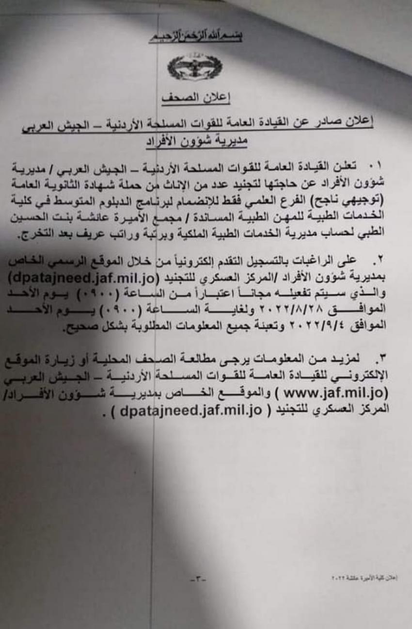 اعلنت القيادة العامة للقوات المسلحة الأردنية – الجيش العربي / مديرية شؤون الأفراد، عن حاجتها لتجنيد عدد من الإناث من حملة شهادة الثانوية العامة (توجيهي ناجح) الفرع العلمي فقط للإنضمام لبرنامج الدبلوم المتوسط في كليـة الخدمات الطبيـة للمهن الطبية المساندة / مجمع الأميرة عائشة بنت الحسين الطبي لحساب مديرية الخدمات الطبية الملكية وبرتبة وراتب عريف بعد التخرج.