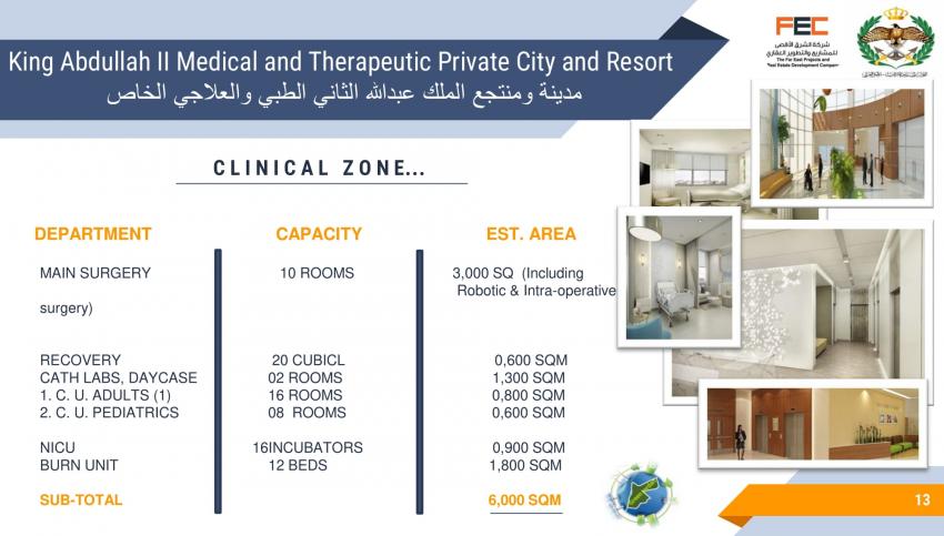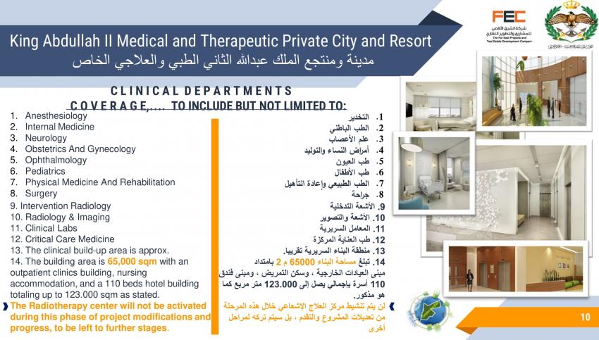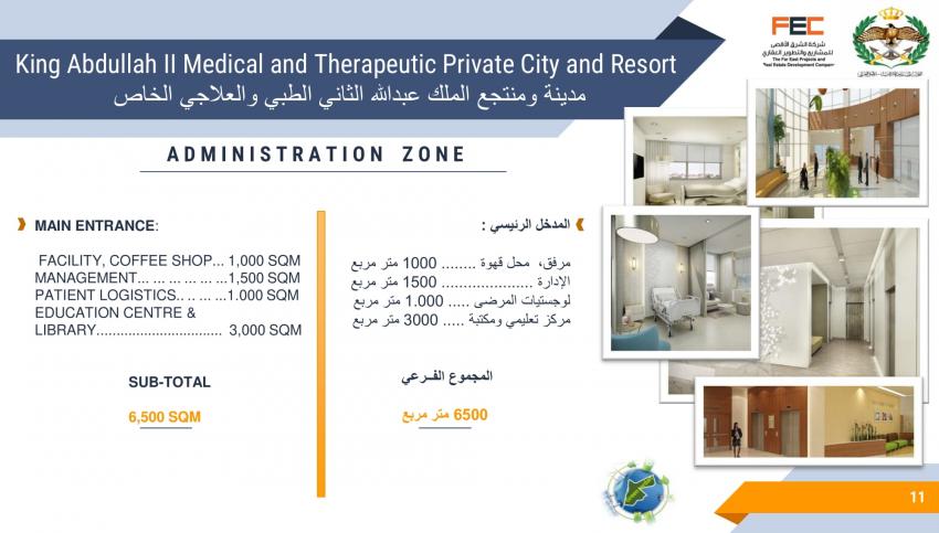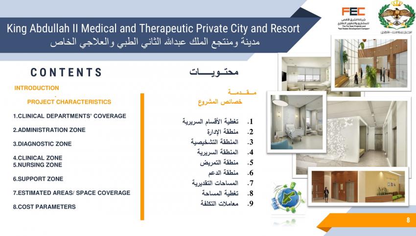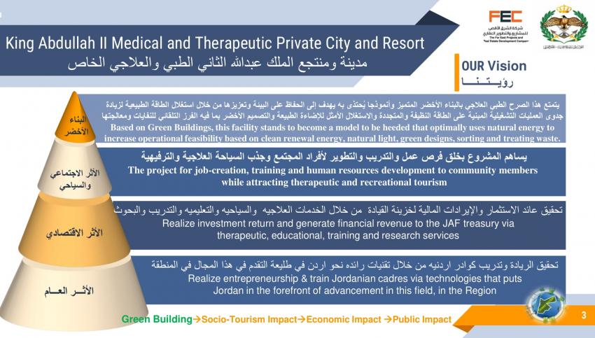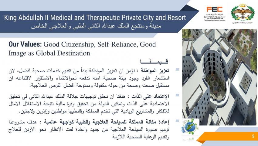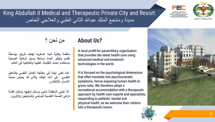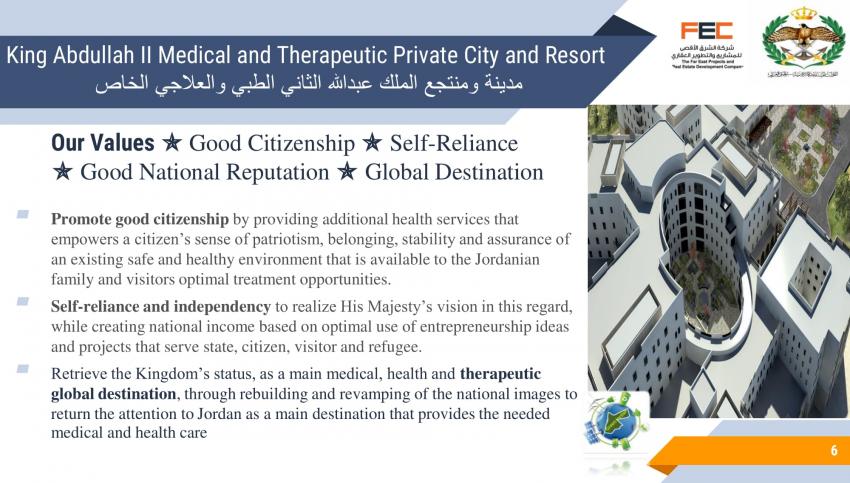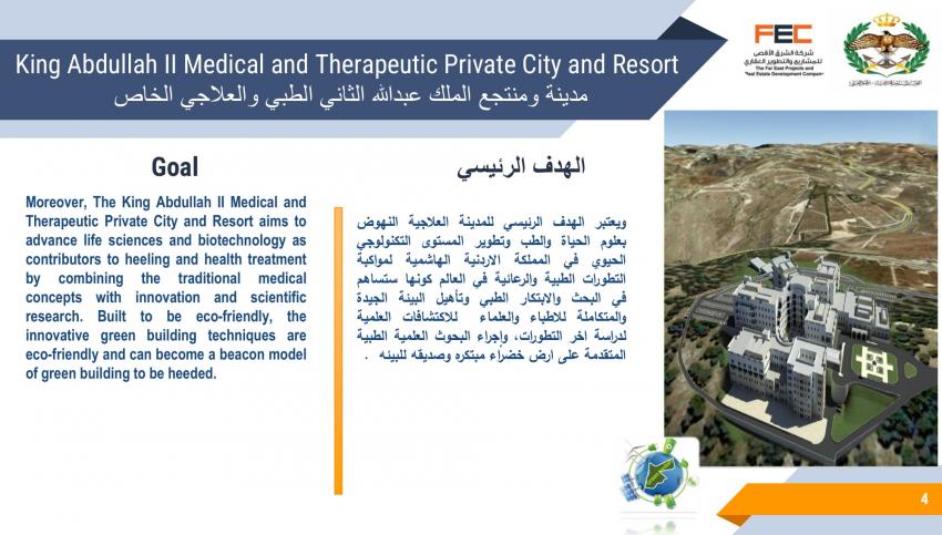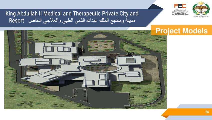كشف تصميم مشروع مقترح لمدينة ومنتجع الملك عبدالله الثاني الطبي والعلاجي الخاص، عن تفاصيل المشروع المقترح إقامته في لواء ناعور بالعاصمة عمان.