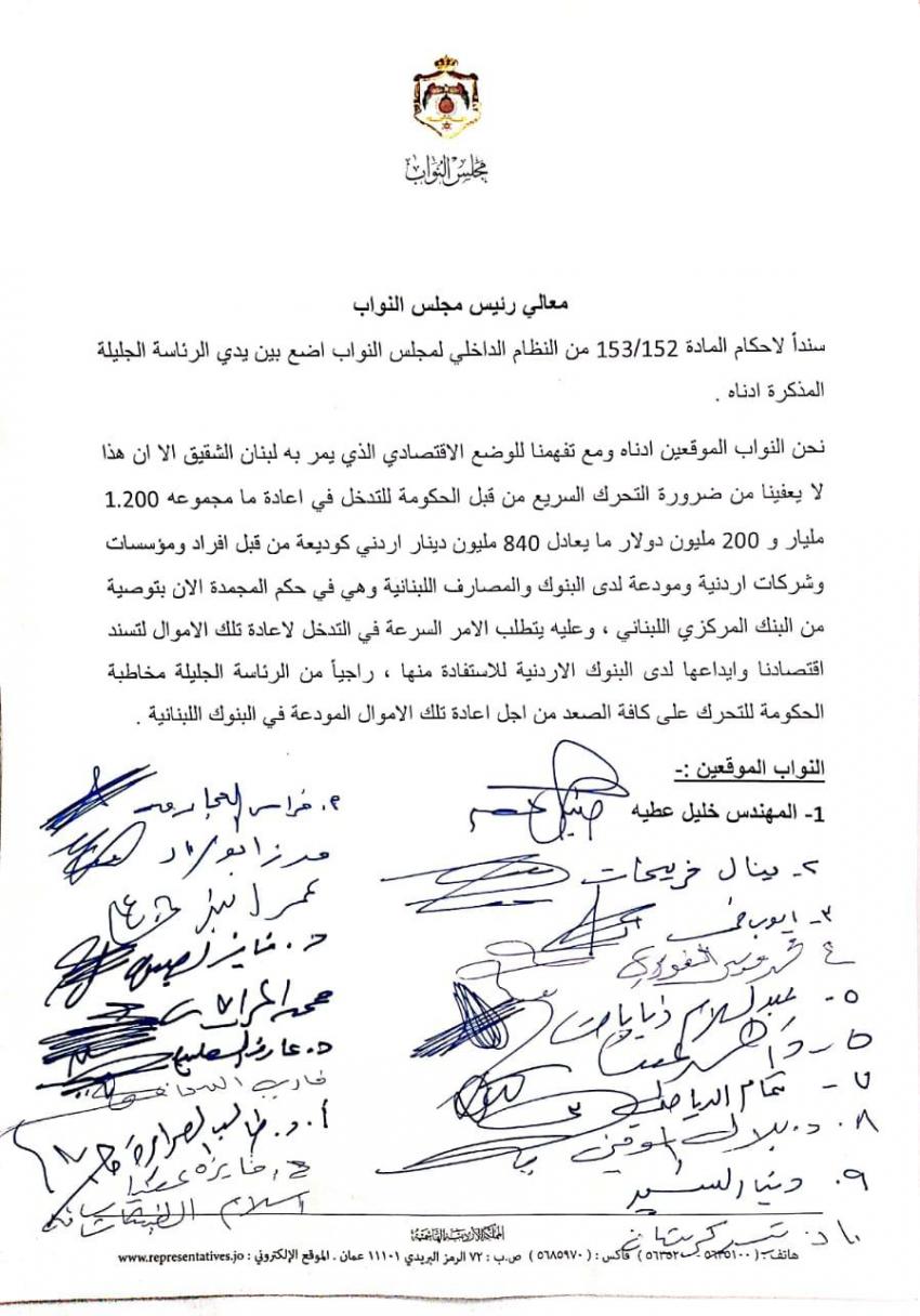 وقال عطية في المذكرة، "ومع تفهمنا للوضع الاقتصادي الذي يمر به لبنان الشقيق الا ان هذا لا يعفينا من ضرورة التحرك السريع من قبل الحكومة للتدخل في إعادة ما مجموعه 1.200 مليار دولار ما يعادل 840 مليون دينار اردني كوديعة من قبل افراد ومؤسسات وشركات اردنية ومودعة لدى البنوك والمصارف اللبنانية وهي في حكم المجمدة الان بتوصية من البنك المركزي اللبناني.