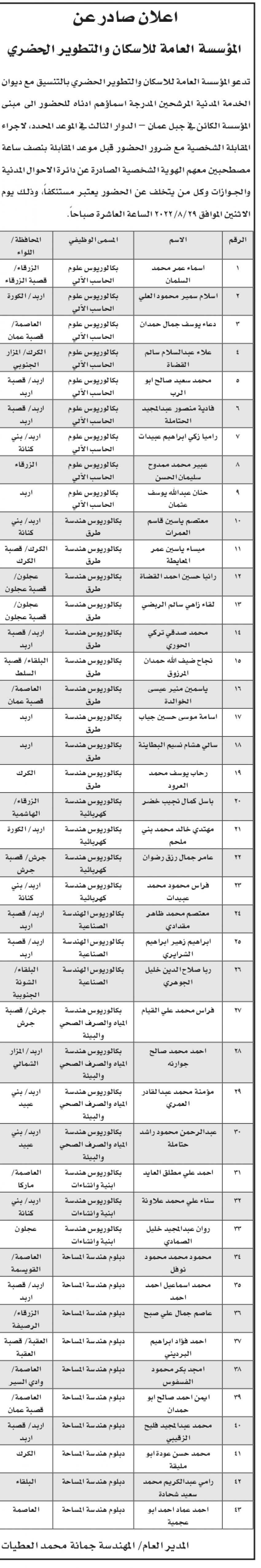 دعت المؤسسة العامة للإسكان والتطوير الحضري بالتنسيق مع ديوان الخدمة المدنية المرشحين ادناه؛ لإجراء المقابلة الشخصية.