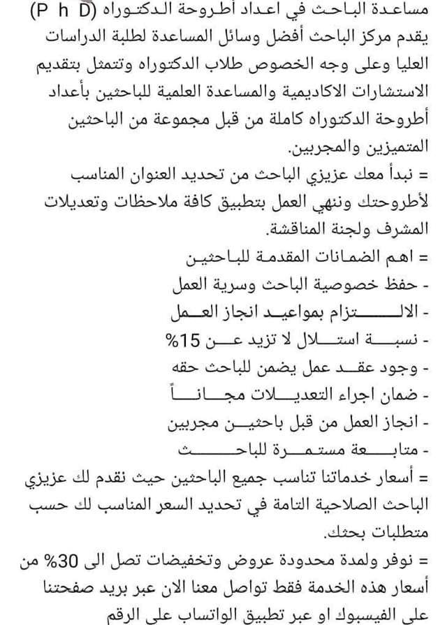 ونشر نموذجًا لإعلانات تروج لها مراكز تجارية حيث توجد الجامعات، جاء فيه أن هذا المركز على استعداد لمساعدة طلاب الدرسات العليا، بخاصة الدكتوراة، في الاستشارات الأكاديمية والمساعدة العلمية للباحثين بإعداد رسائل الدكتوراة كاملة من قبل مجموعة من الباحثين المجربين. والغريب أن هذا المركز صاحب الإعلان على استعداد أن يبدأ بالمساعدة منذ الخطوات الأولى، حتى اختيار عنوان الأطروحة. وفي التفاصيل تفاصيل أخرى يندى لها الجبين، أبرزها عرض محدود المدة عن تخفيضات بنسبة 30% على إعداد رسائل الدكتوراة. لكن الأغرب من كل ذلك أن الإعلان مليء بالأخطاء الإملائية والنحوية، فكيف تقبلون على أنفسكم، يا طلاب العلم، الاعتماد على مراكز لإعداد إطروحاتكم، تخطىء في اللغة العربية؟