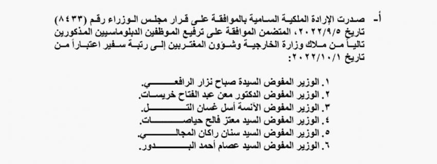 أحداث اليوم - صدر في عدد الجريدة الرسمية اليوم الأحد الارادة الملكية السامية بترفيع 6 دبلوماسيين في وزارة الخارجية وشؤون المغتربين إلى رتبة سفير اعتبارا من 1 تشرين الاول.والدبلوماسيون هم: