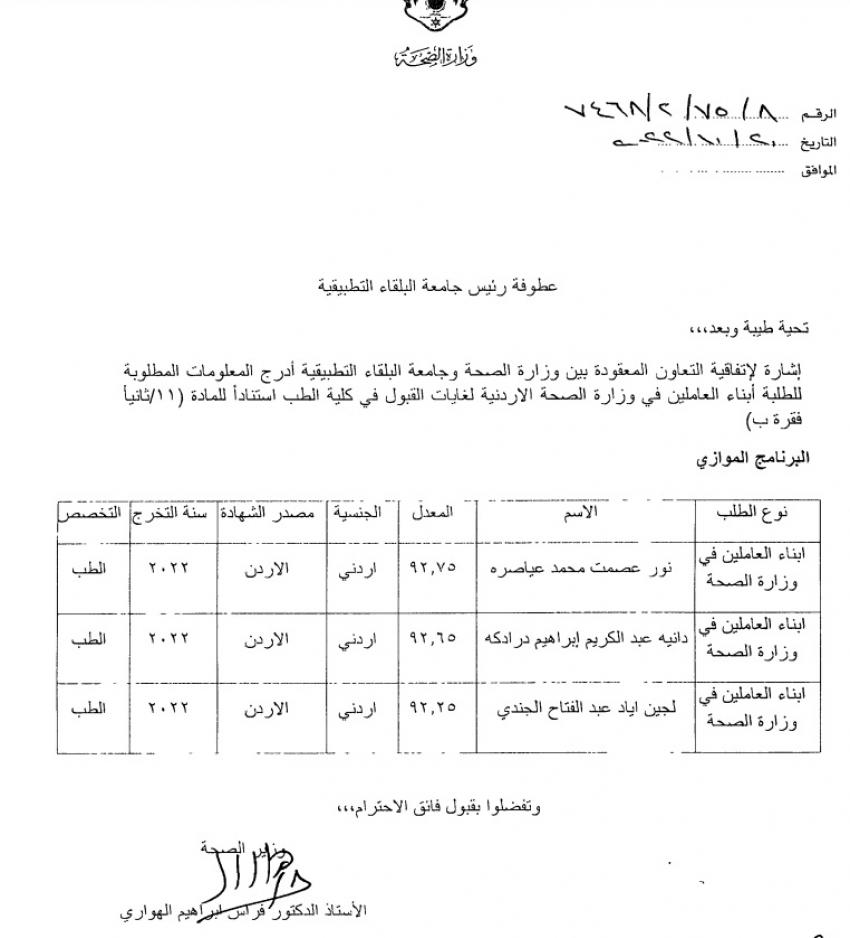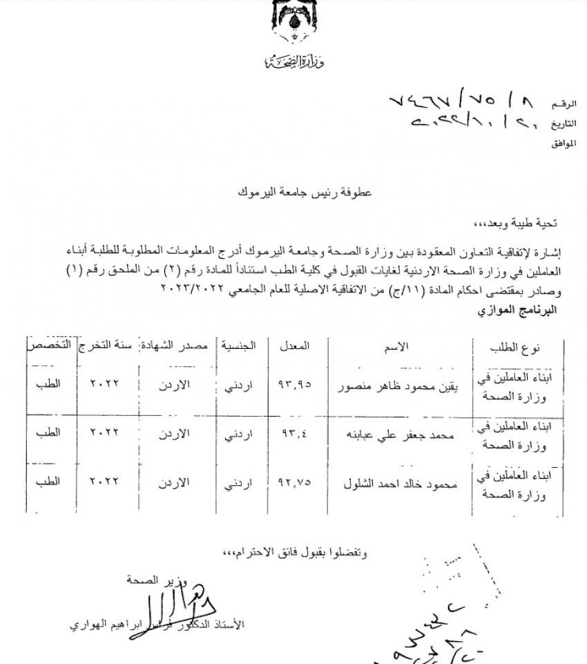 أعلنت وزارة الصحة اليوم الاثنين، أسماء مقاعد الطب لأبناء العاملين في الوزارة على نظام الموازي بجامعتي اليرموك والبلقاء.وتاليا اسماء الطلبة المقبولين: