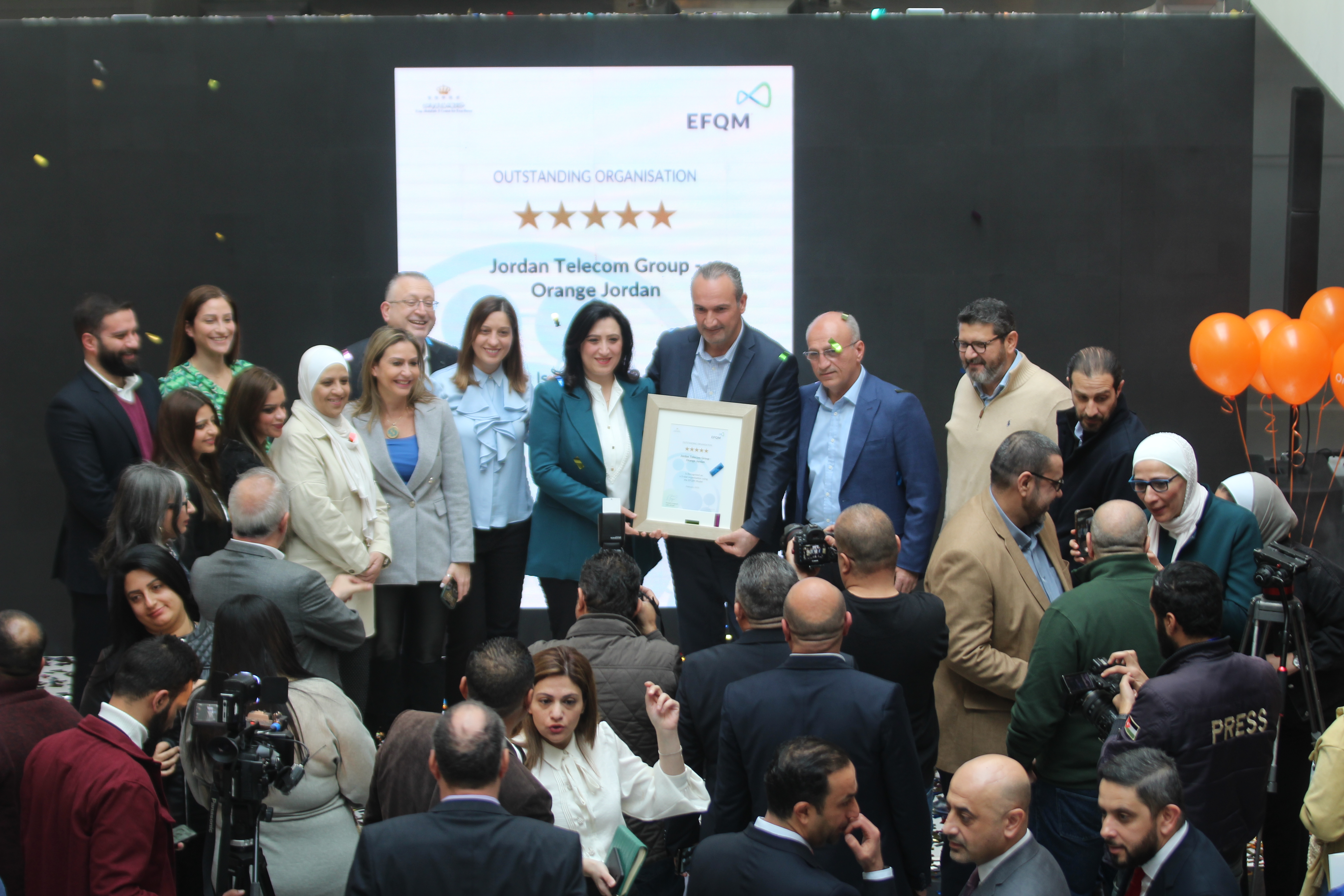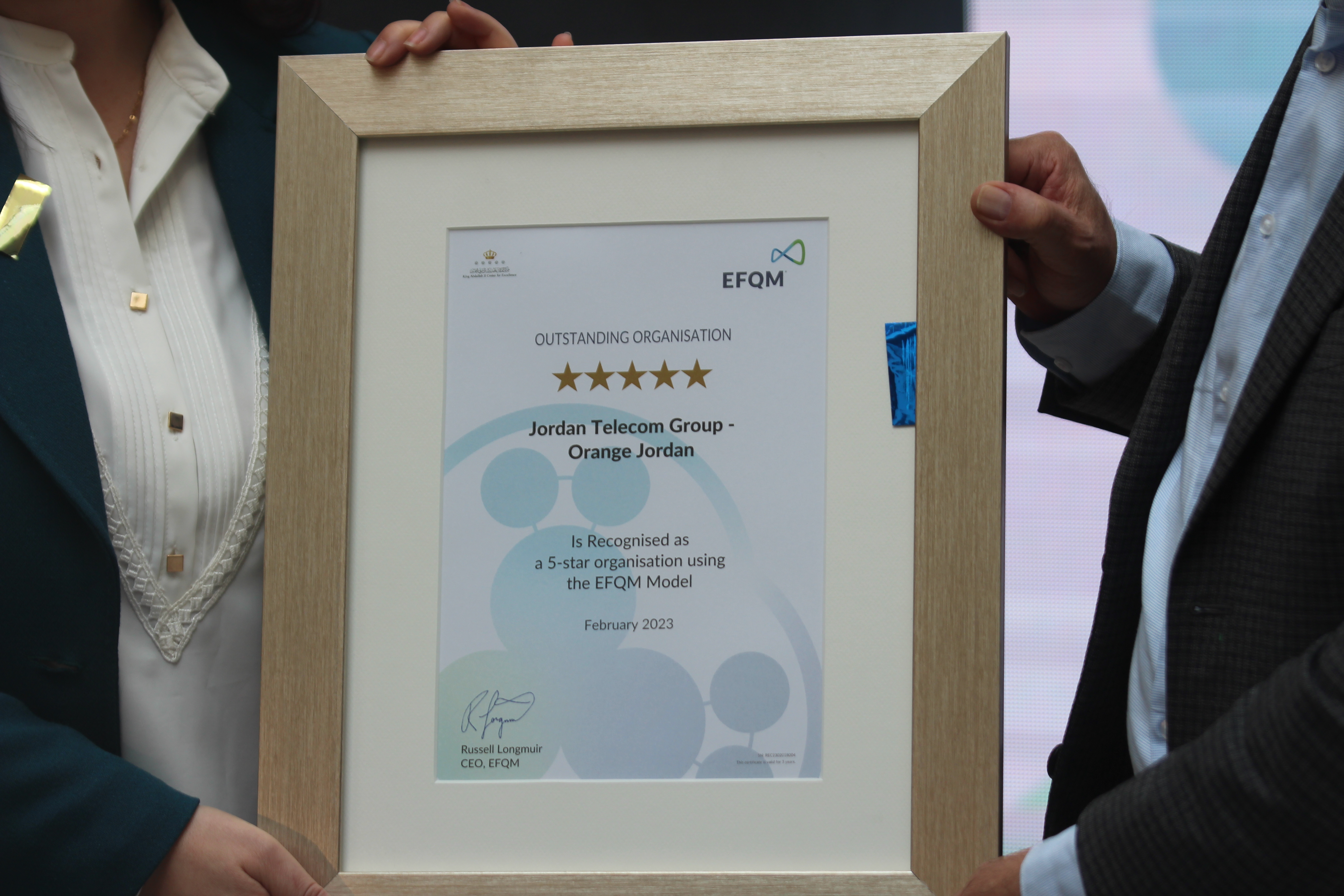 أحداث اليوم - احتفلت أورنج الأردن بنيلها شهادة الاعتراف بالتميز (EFQM Recognized for Excellence) للمرة الثانية وبتقييم أعلى وصل إلى 5 نجوم، من المؤسسة الأوروبية لإدارة الجودة (EFQM) من خلال الممثل الرسمي للمؤسسة في المملكة، مركز الملك عبدالله الثاني للتميز، لتصبح أولى شركات الاتصالات في الأردن والشرق الأوسط التي تحصل على شهادة EFQM بتقييم 5 نجوم وفق النموذج الجديد.