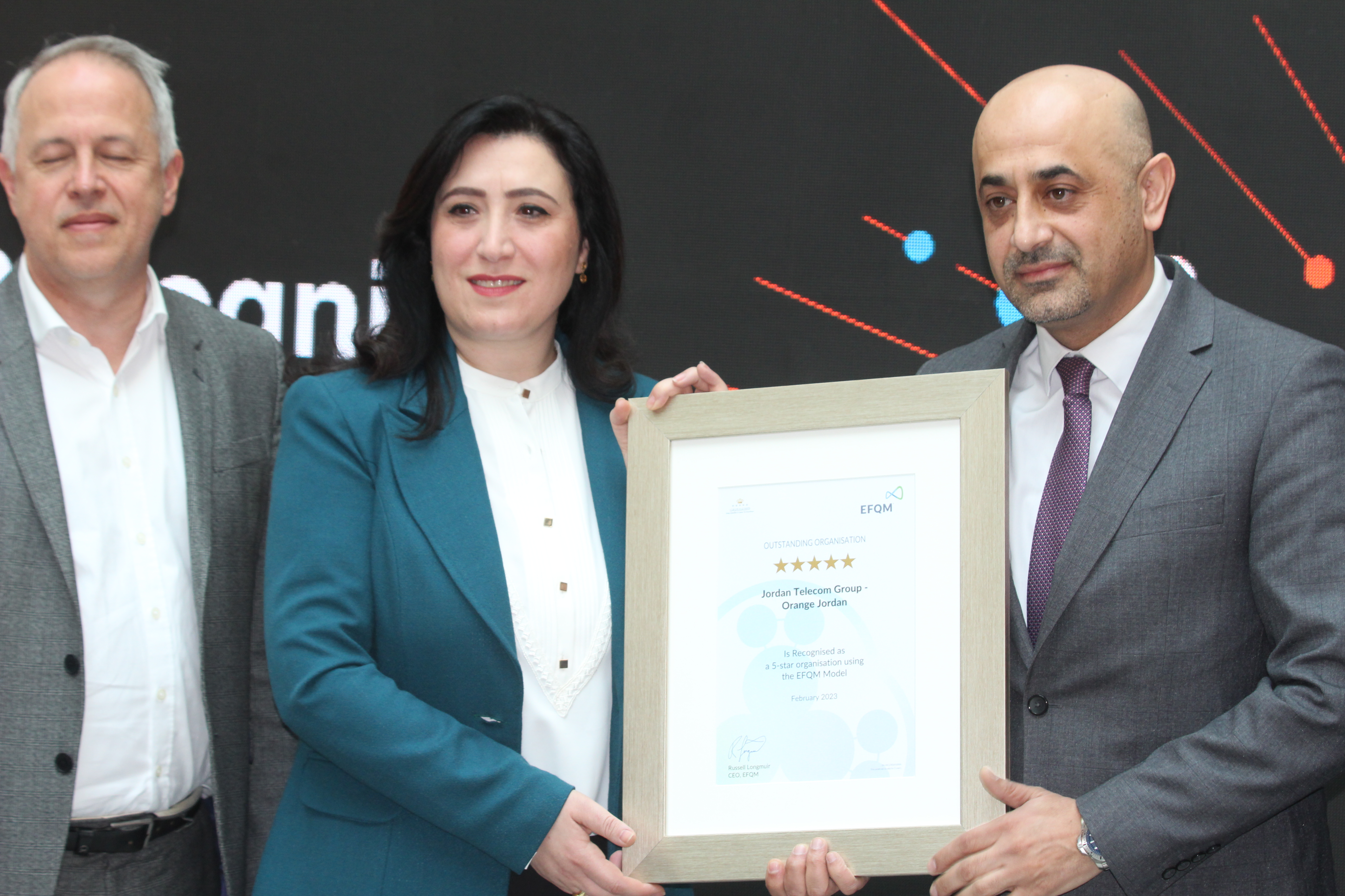 وفي ختام كلمته، قدم الدكتور الروابدة التهنئة لشركة أورنج الأردن بحصولها على تميز بمستوى خمسة نجوم من المؤسسة الأوروبية لإدارة الجودة (EFQM) كونها شركة بمستوى عالمي إثر عملية تقييم لممارساتها الإدارية في نهج التميز الذي تتبناه، والذي تم من خلاله تحديد نقاط القوة الرئيسية وفرص التحسين في منظومتها الإدارية لدعم توجهها لتحقيق التميز المستدام.