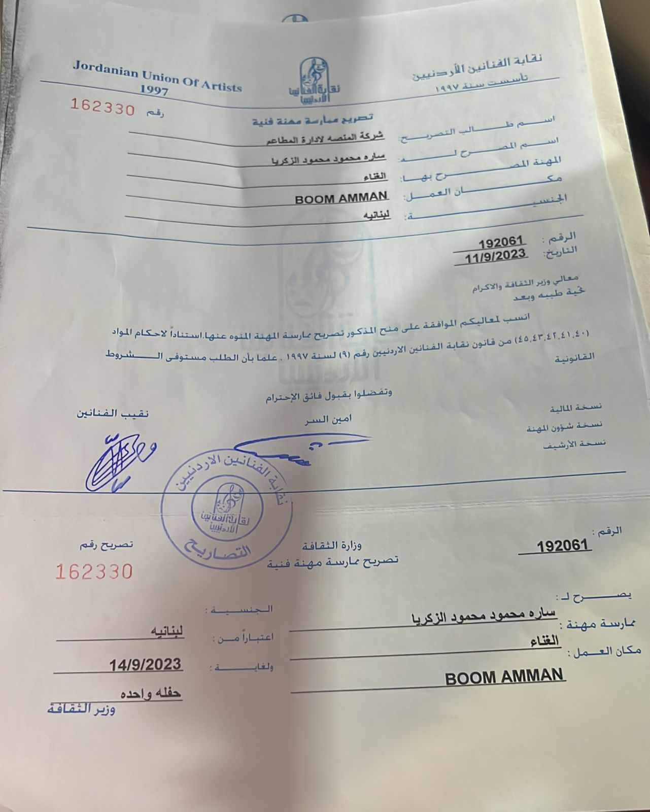 وأشارت إلى أن الحفل سيقام وفقًا للقانون وفي الموعد المحدد سابقًا، حيث حصلت على تصريح من نقابة الفنانين الاردنية .
