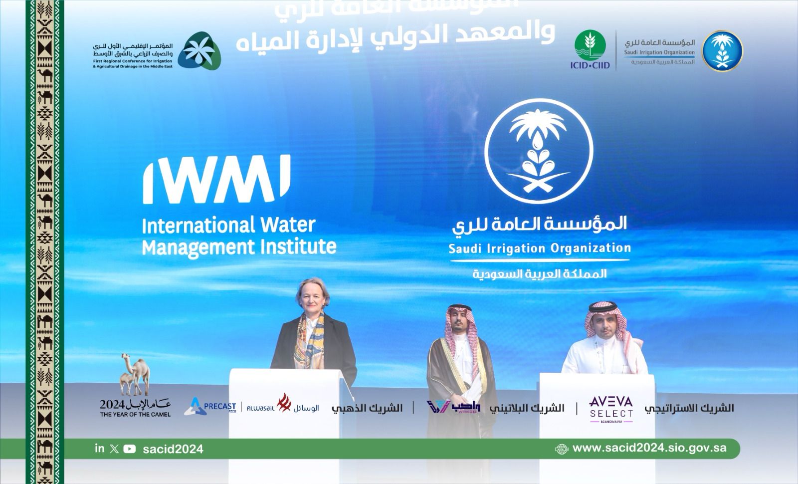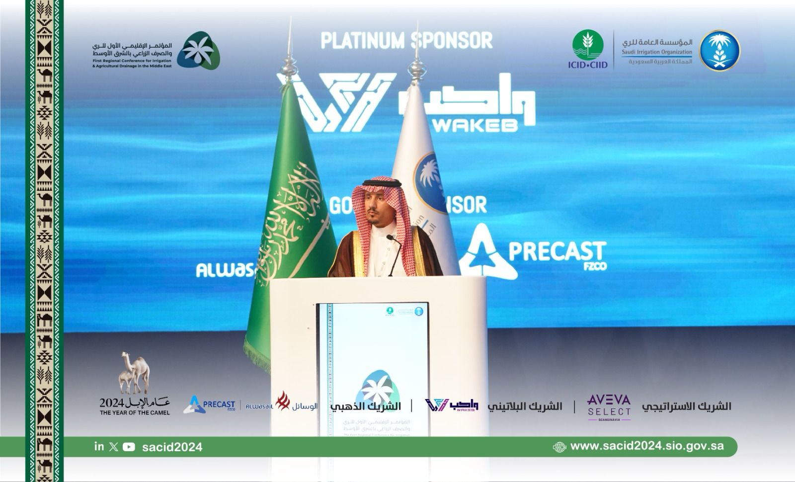 افتتحت يوم أمس الإثنين جلسات المؤتمر الإقليمي الأول للري والصرف الزراعي بالشرق الأوسط تحت شعار "الإدرة المتكاملة لقطاع الري لتنمية مرنة ومستدامة"، والذي تنظمه المؤسسة العامة للري بالتعاون مع المنظمة الدولية للري والصرف (ICID) برعاية معالي المهندس / عبد الرحمن بن عبدالمحسن الفضلي، وزير البيئة والمياه والزراعة وحضور الدكتور حازم الناصر وزير المياه والرى الأردني السابق بالإضافة لحضور دولي وإقليمي كبير.