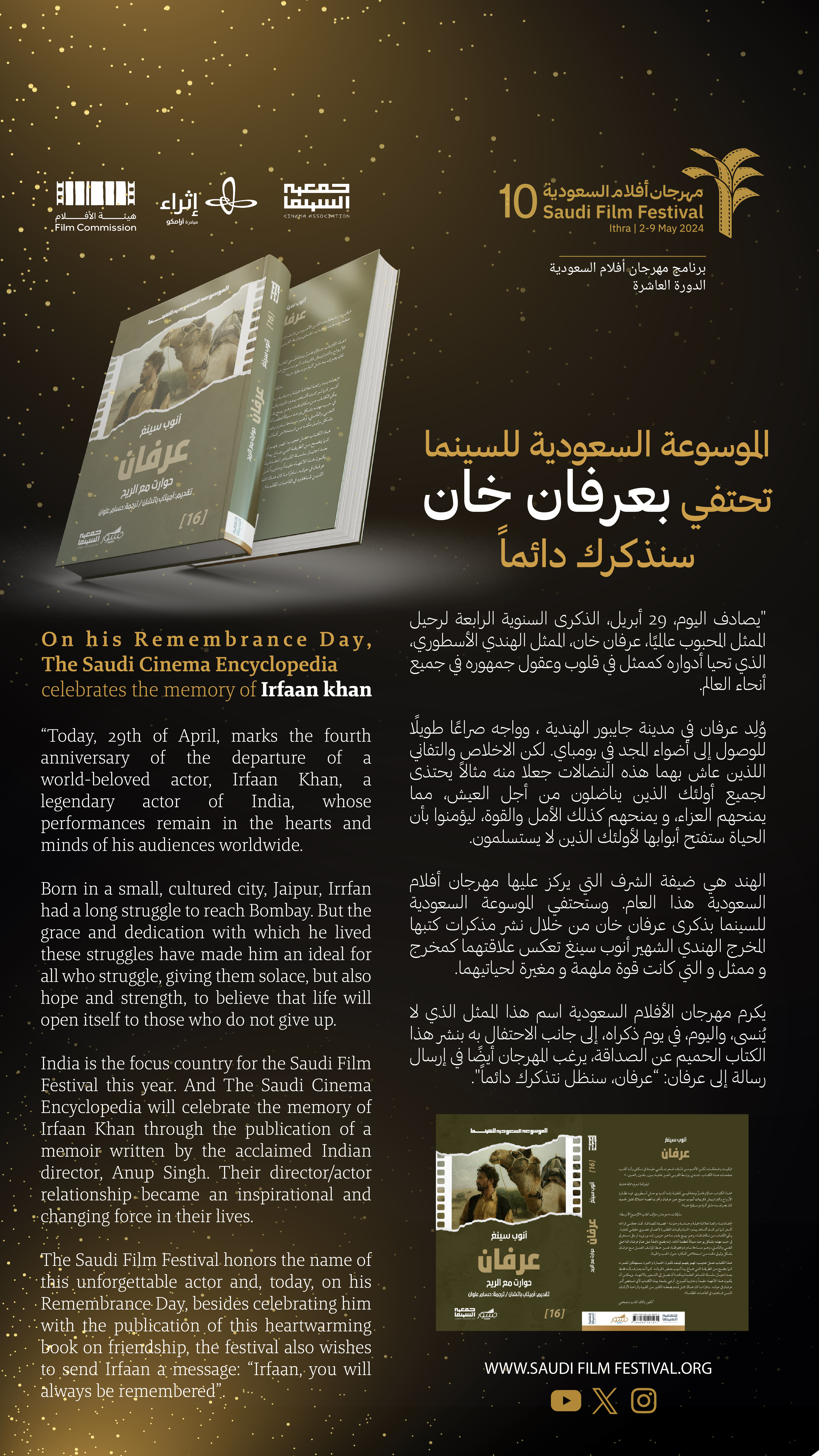 يكرّم مهرجان أفلام السعودية اسم هذا الممثل الذي لا يُنسى، واليوم، في يوم ذكراه، إلى جانب الاحتفال به بنشر هذا الكتاب الحميم عن الصداقة، يرغب المهرجان أيضاً في إرسال رسالة إلى عرفان: "عرفان، سنظل نتذكرك دائماً".