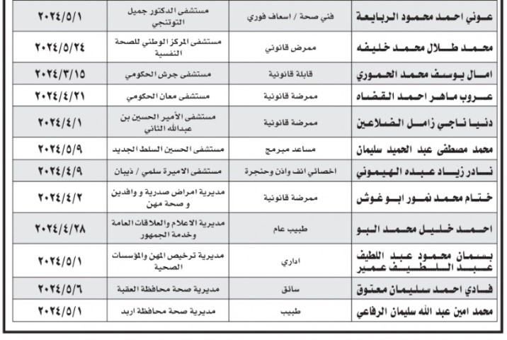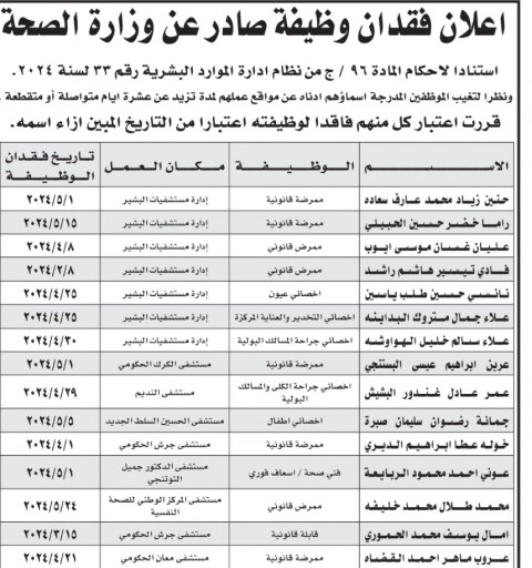 أحداث اليوم - كشفت وزارة الصحة عن قائمة بأسماء الفاقدين لوظائفهم اعتباراً من التاريخ المبين إزاء اسم كل منهم، واستنادا لأحكام المادة 170 من نظام الخدمة المدنية.