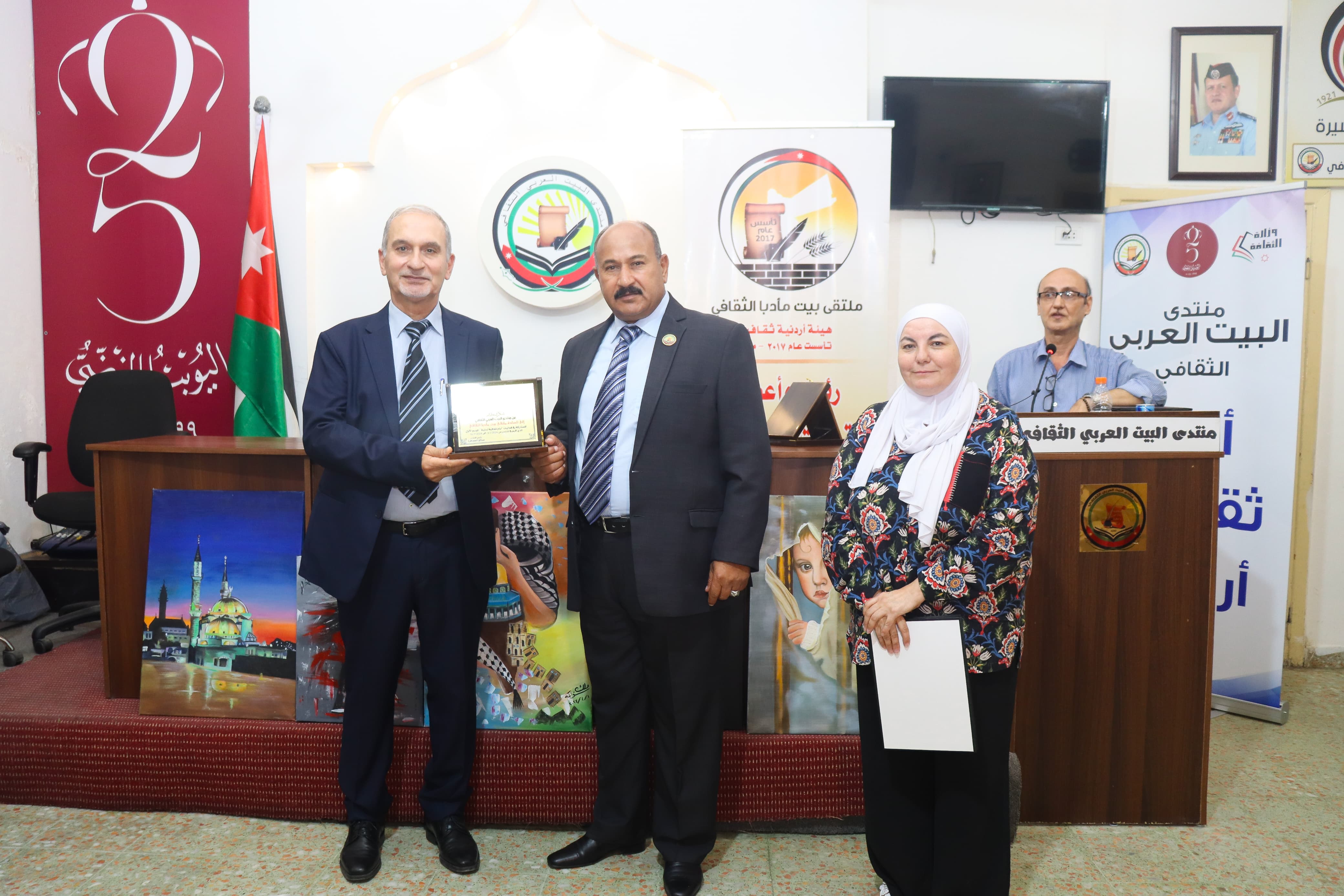وختاما قدم رئيس منتدى البيت العربي الثقافي المهندس صالح الجعافرة درعا تذكاريا لملتقى بيت مأدبا الثقافي ممثلا برئيسه أ.فوزان الحوراني.