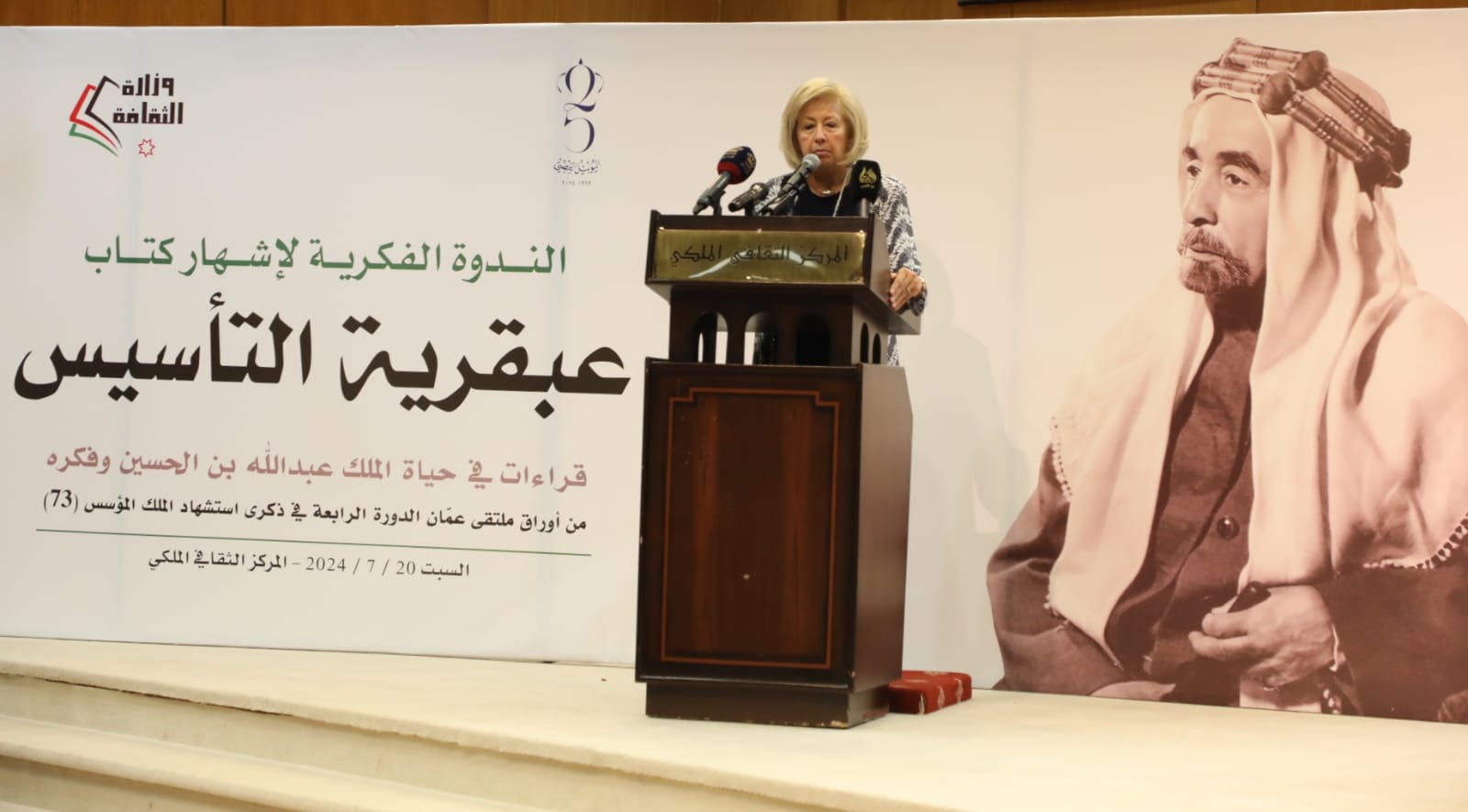 وأشارت إلى أن هذا الكتاب، هو حصيلة أوراق بحثية عقدت ضمن ملتقى عمان الرابع 1995، في ذكرى استشهاد المغفور له بإذن الله الملك المؤسس، وتم جمعها بعد 3 عقود وتمثل قراءات في حياة الملك المؤسس وفكره، قدمها مجموعة من القامات الفكرية والسياسية والثقافية، وترصد لحظة العبقرية في تأسيس الدولة الأردنية التي نمت في ظل ظروف عالمية معقدة، وتحديات إقليمية عاصفة، لافتة إلى أن وزارة الثقافة تبني على إنجاز تراكمي.