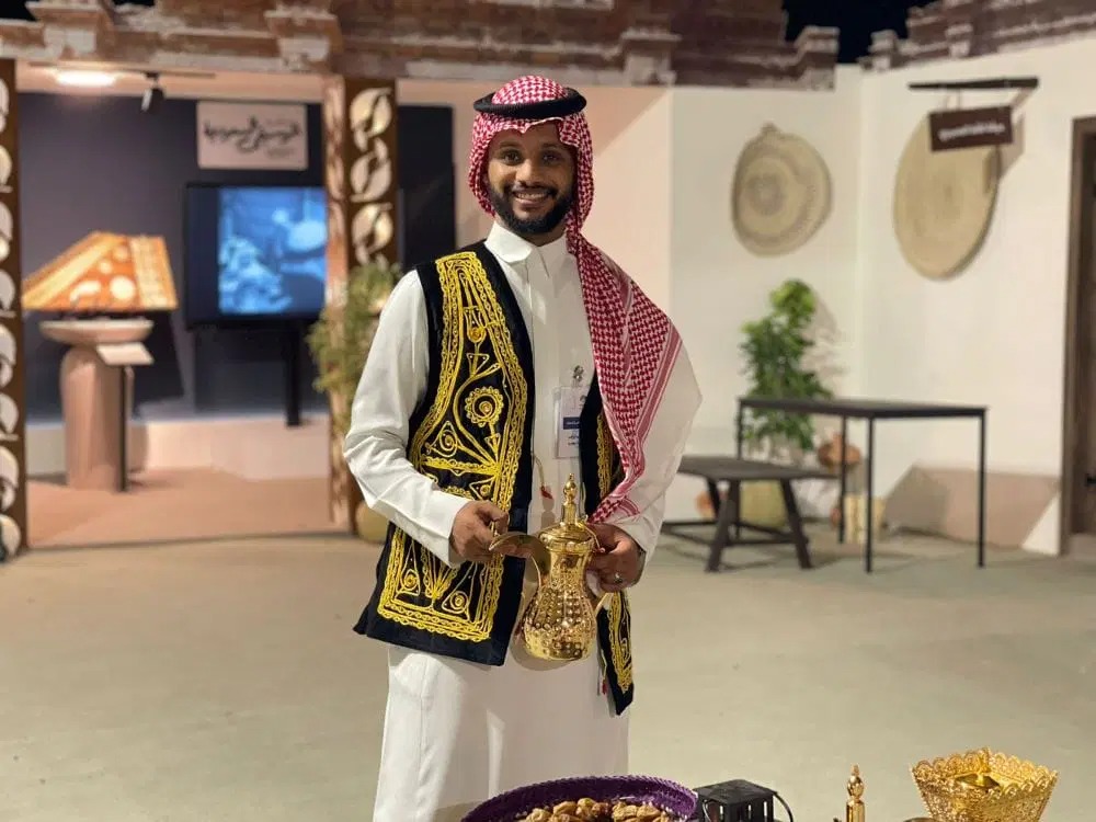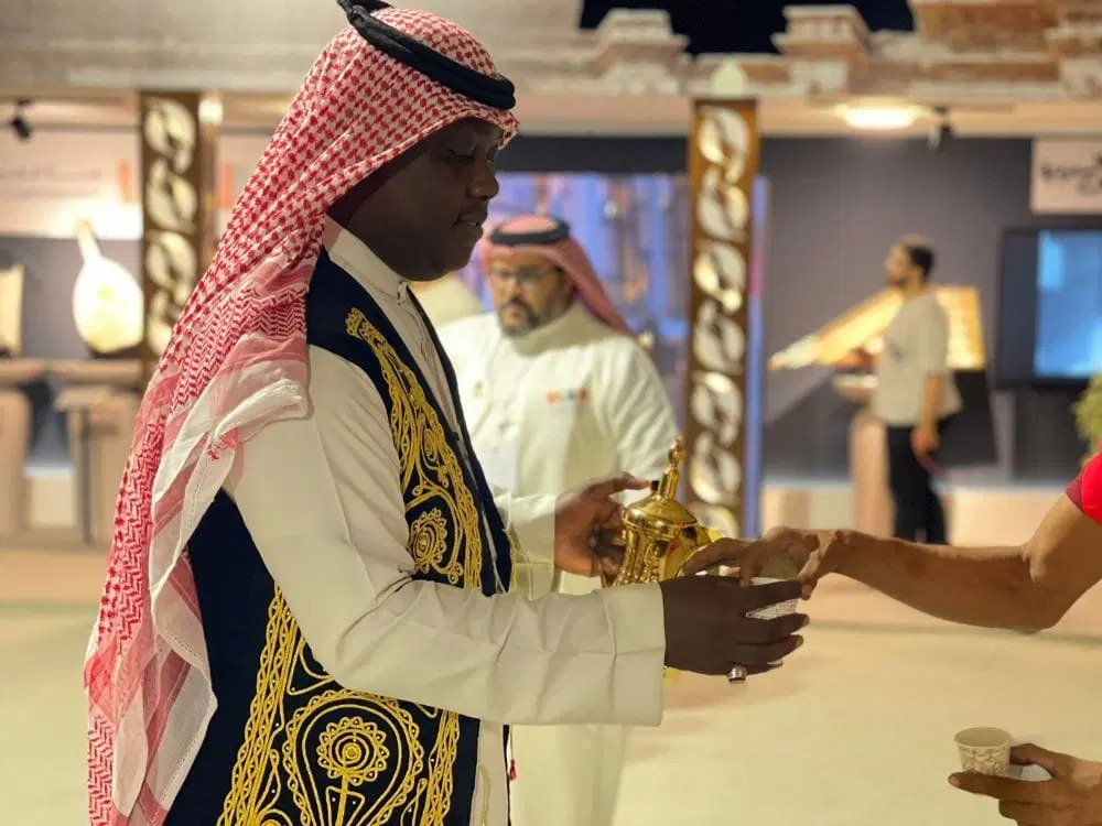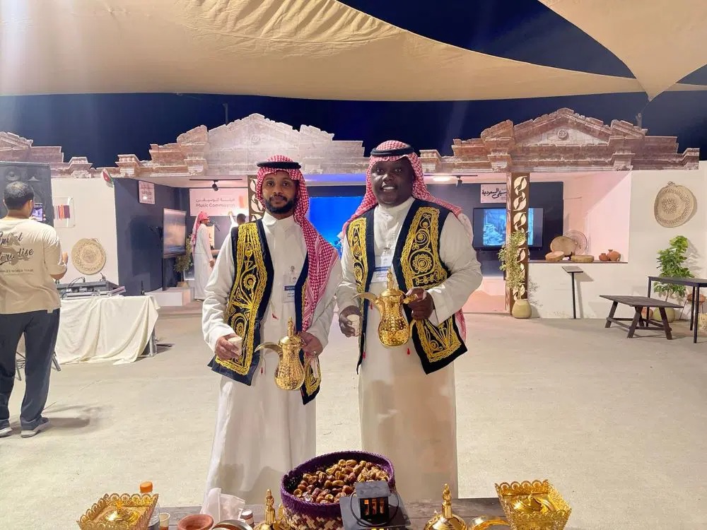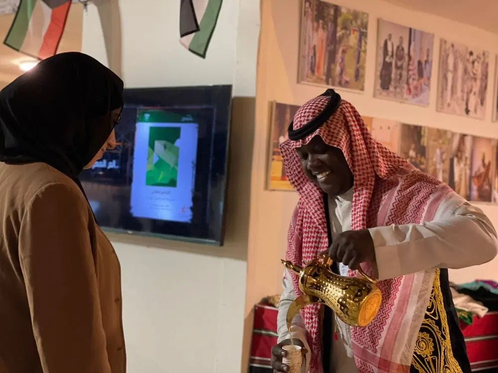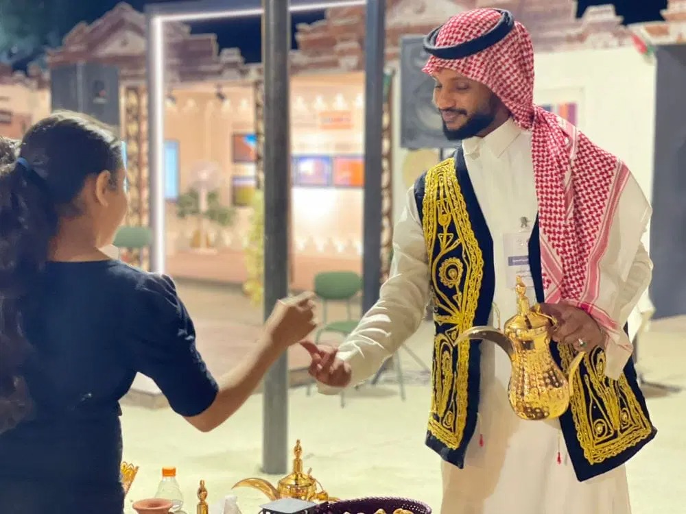 وقدمت القهوة السعودية في الجناح بأسلوبها التقليدي، حيث يقوم المضيف بصب القهوة في فناجين صغيرة، ويقدمها بيده اليمنى، في تعبير عن الاحترام والتقدير للضيف. كما تم شرح طقوس تحضير القهوة للزوار، بدءاً من طحن البن الطازج، وإضافة الهيل، وحتى تقديمها مع التمر، مما أضفى بعدًا تعليميًا وثقافيًا على التجربة.