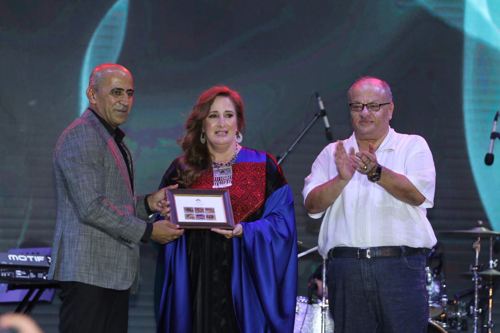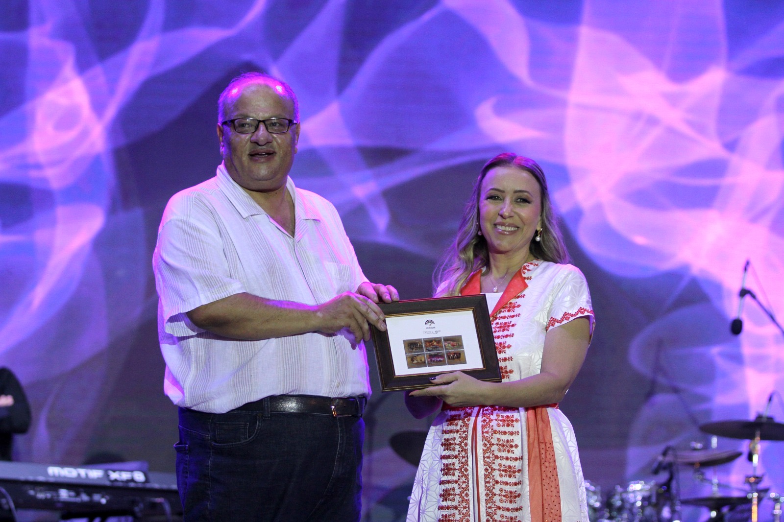وكرم المدير التنفيذي لمهرجان جرش ايمن سماوي و رئيس بلدية جرش احمد العتوم الفنانة الأردنية مكادي نحاس بدرع المهرجان.