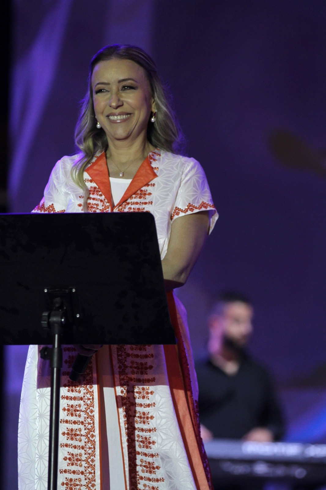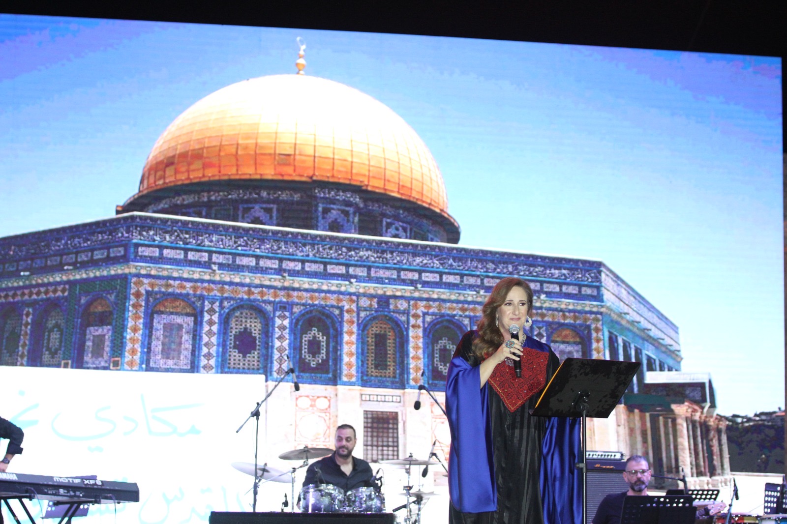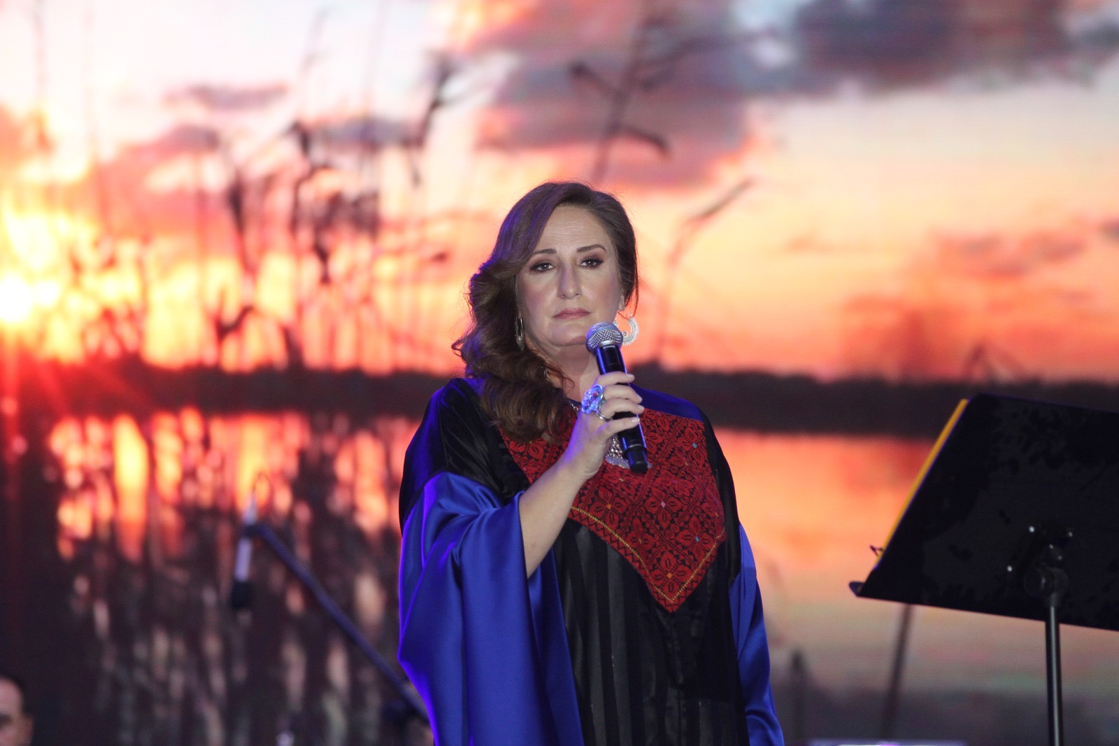 و بدأت وصلتها الفنية بأغنية "يمه مولي الهوى" ولترحل بعدها بالجمهور وتطلب دقيقة صمت على ارواح شهداء غزة حيث قالت" عندما تذكر غزة لا يسعنا إلا الانحناء على كل دقيقة صمود وتضحية منهم.. لنقف دقيقة صمت على ارواح شهدائهم".