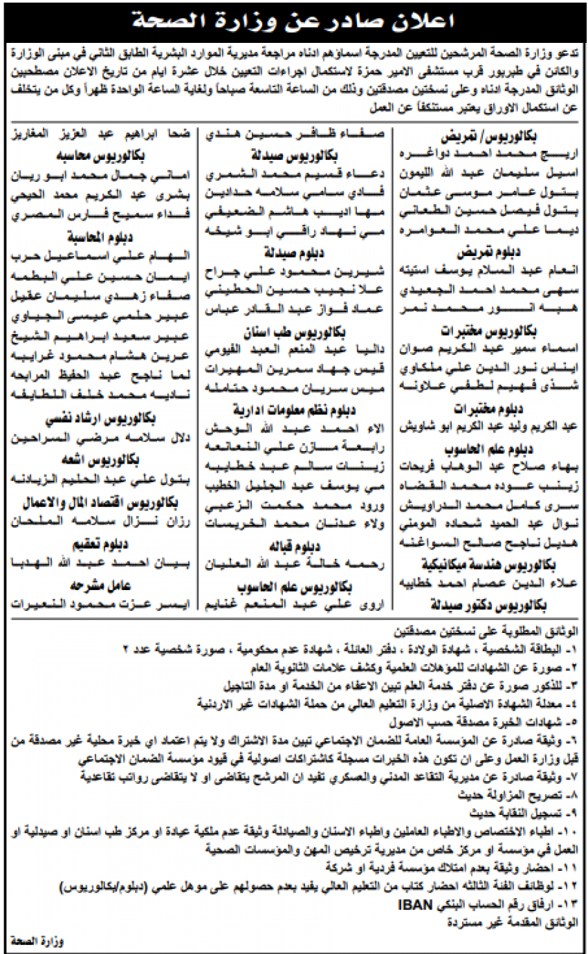 أحداث اليوم - وبحسب الإعلان المنشور في الصحف اليومية، يتوجب على المرشحين التواجد في مبنى الوزارة الكائن في منطقة طبربور خلال 10 أيام، وكل من يتخلف عن استكمال الأوراق يُعتبر مستنكفًا عن العمل.وتايا الأسماء: