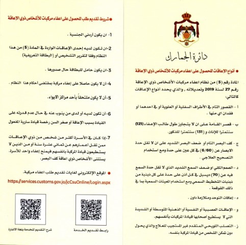 أحداث اليوم - نشرت دائرة الجمارك الأردنية التعليمات الخاصة بشروط منح إعفاء مركبات للأشخاص ذوي الإعاقة.وأوضحت الجمارك أنواع الإعاقات التي يمكن من خلال الحصول على إعفاء مركبات وكذلك الشروط للحصول على الإعفاء.وتاليا الشروط: