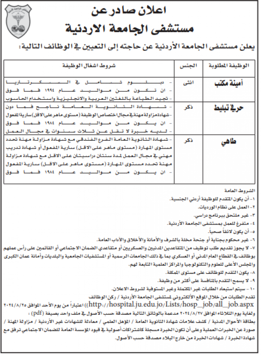 أحداث اليوم - أعلن مستشفى الجامعة الأردنية اليوم الأربعاء عن حاجته إلى تعيين عدد من حملة شهادة الدبلوم والثانوية العامة لملء الشواغر التالية: