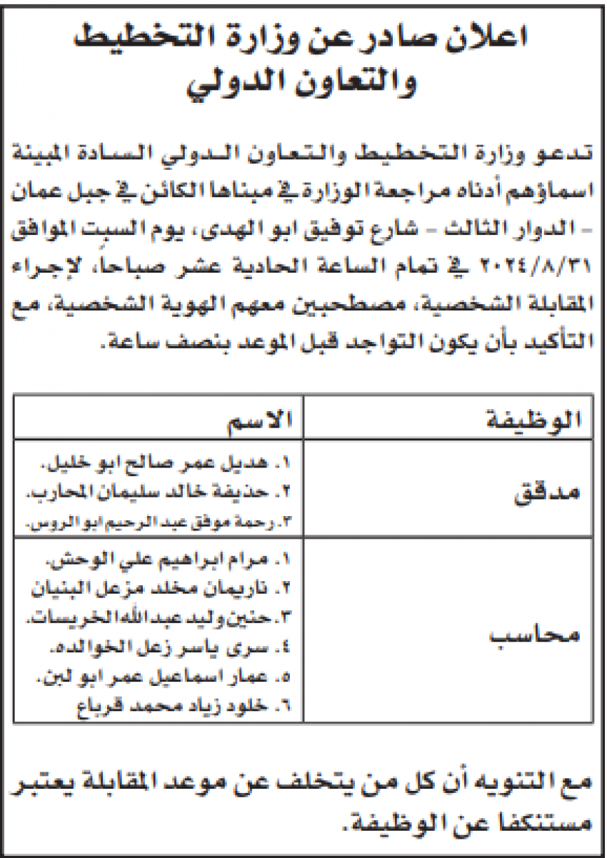 أحداث اليوم - دعت وزارات ومؤسسات حكومية وبلديات ،اليوم الثلاثاء، التالية اسماؤهم للمقابلات الشخصية لغايات استكمال التعيين.وكما أعلنت عدد من المؤسسات عن توفر شواغر لديها.وتاليا الأسماء: