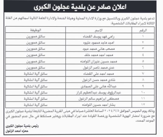 أحداث اليوم - أعلنت عدداً من البلديات والمؤسسات الرسمية، اليوم الأحد، عن حاجتهم لتعبئة وظائف شاغرة، فيما دعت عددا من المرشحين لاجراء المقابلات الشخصية .وتاليا التفاصيل: