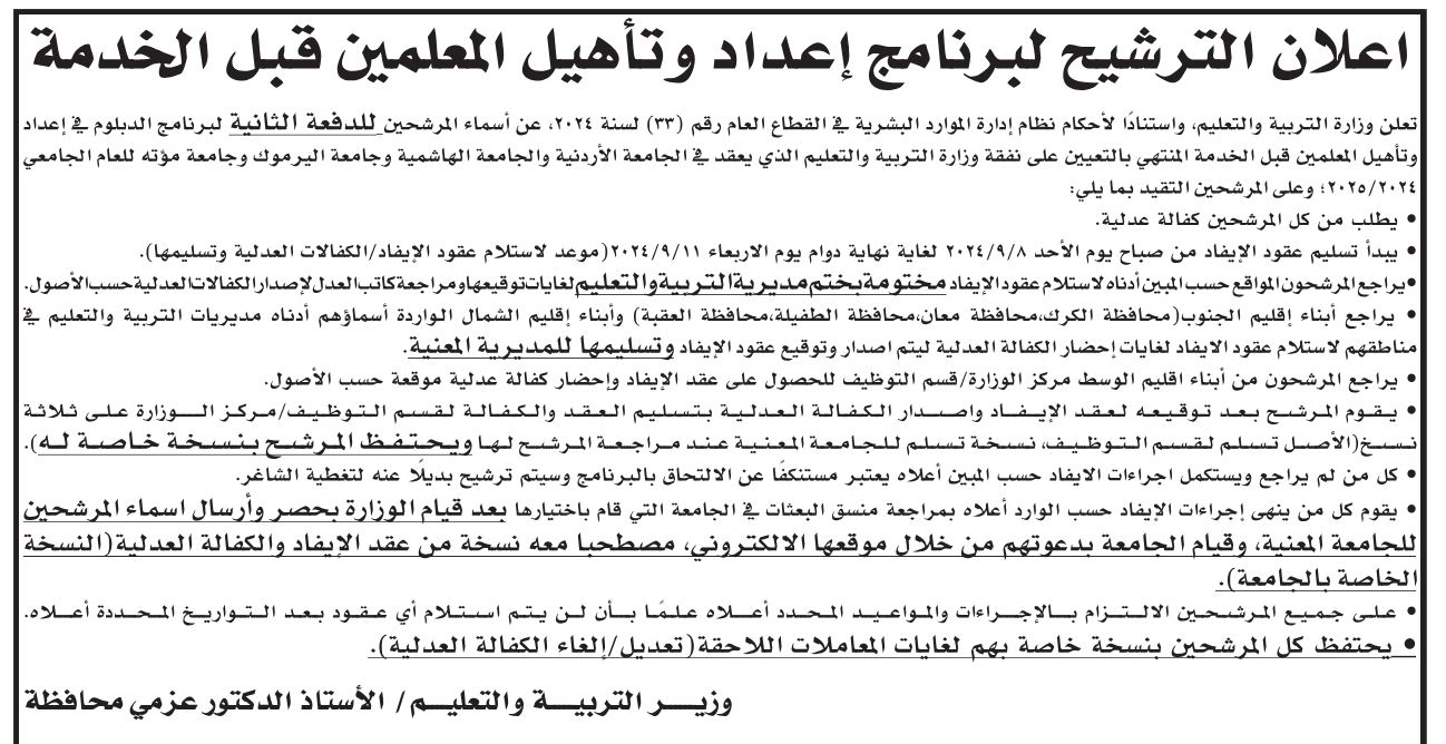 “التربية” تعلن أسماء المرشحين لدبلوم إعداد وتأهيل المعلمين قبل الخدمة