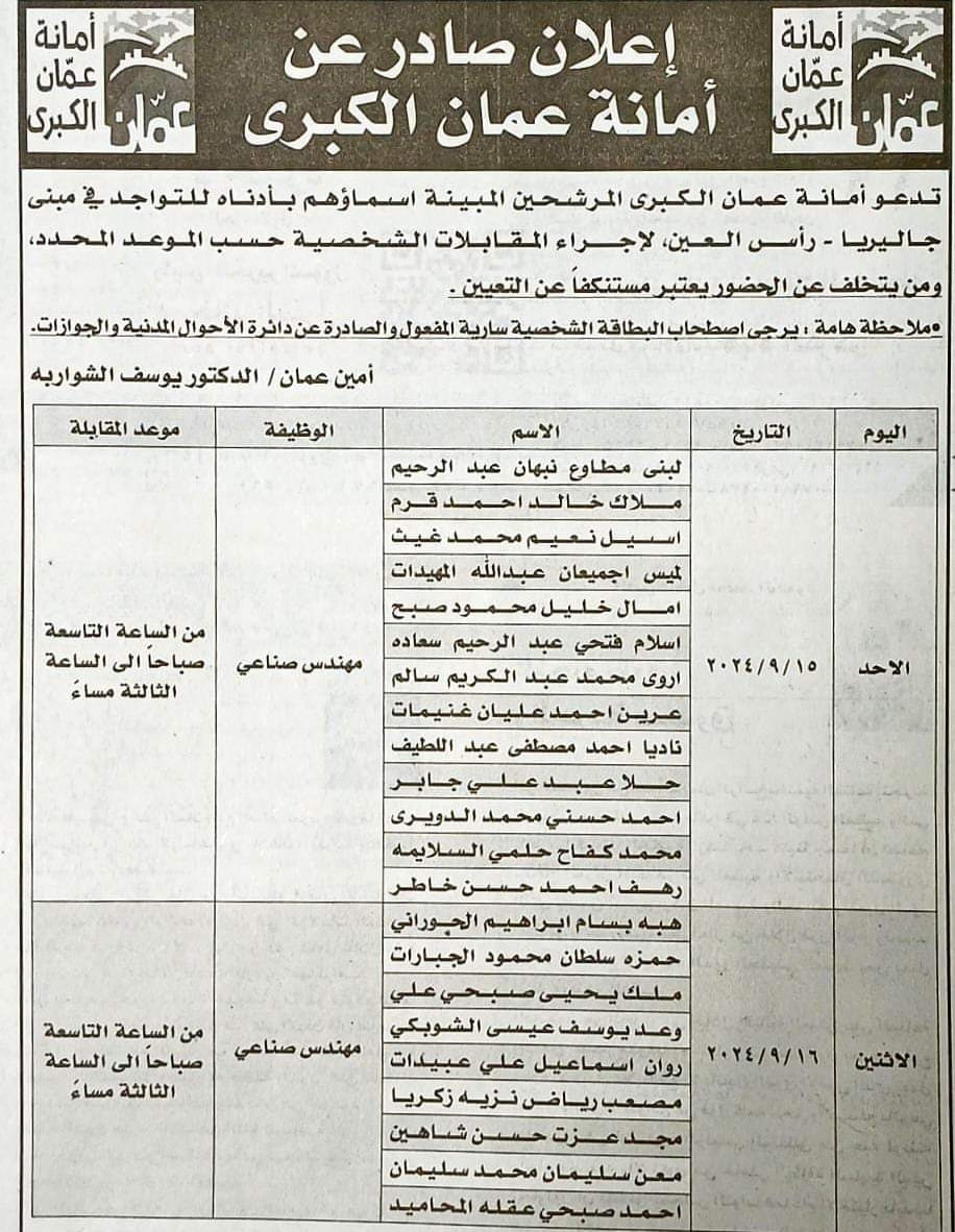 أحداث اليوم - أعلنت أمانة عمان الكبرى عن دعوة عدد من الأشخاص للمقابلة الشخصية بغرض التعيين.وتالياً الأسماء :
