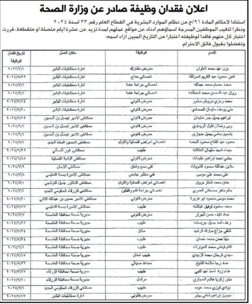 أحداث اليوم - أعلنت وزارة الصحة، اليوم الخميس، عن فقدان موظفين لوظائفهم، وذلك نظرا لتغيبهم عن مواقع عملهم لمدة تزيد عن 10 أيام متصلة أو متقطعة.