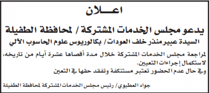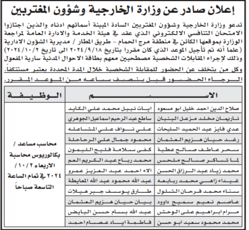 أحداث اليوم - أعلنت عددا من الوزارات والمؤسسات الحكومية ،اليوم الثلاثاء، عن توفر شواغر وظيفية لديها. وكما دعت وزارة الخارجية مرشحين للمقابلة الشخصية لاستكمال اجراءات التعيين.وتاليا التفاصيل: