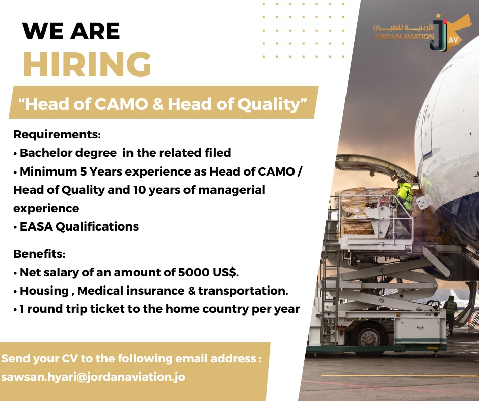 أحداث اليوم - اعلنت الاردنية للطيران عن حاجتها لملئ الشواغر التالية: "رئيس CAMO ورئيس الجودة"أرسل سيرتك الذاتية إلى عنوان البريد الإلكتروني التالي :awsan.hyari@jordanaviation.jo