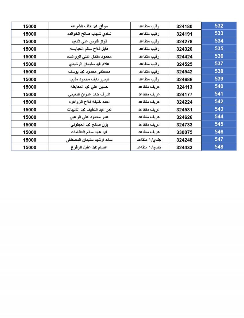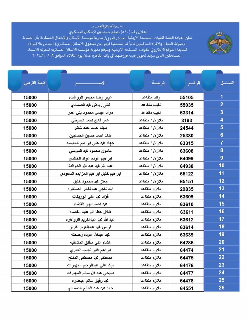 أحداث اليوم - أعلنت القيادة العامة للقوات المسلحة الأردنية – الجيش العربي/ مديرية مؤسسة الإسكان والأشغال العسكرية بان الضباط وضباط الصف والأفراد المبينة أسماءهم أدناه قد استحقوا قرض الإسكان العسكري (الخاص بالافراد) والضباط المستفيدين من صندوق إسكان الضباط مراجعة بنك القاهرة عمان بكافة فروعه خلال ساعات الدوام الرسمي اعتباراً من يوم الثلاثاء الموافق 8/10/2024 للحصول على القرض.