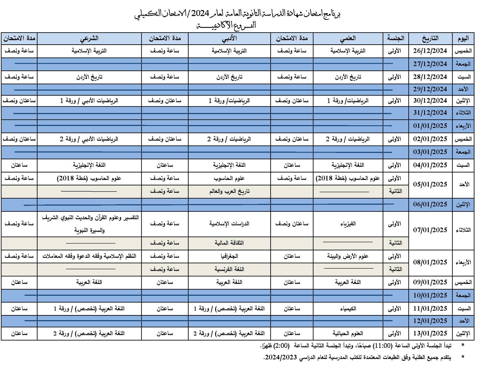 أحداث اليوم - اعلنت وزارة التربية والتعليم جدول امتحان شهادة الدراسة الثانوية العامة لعام 2024 / الامتحان التكميلي.