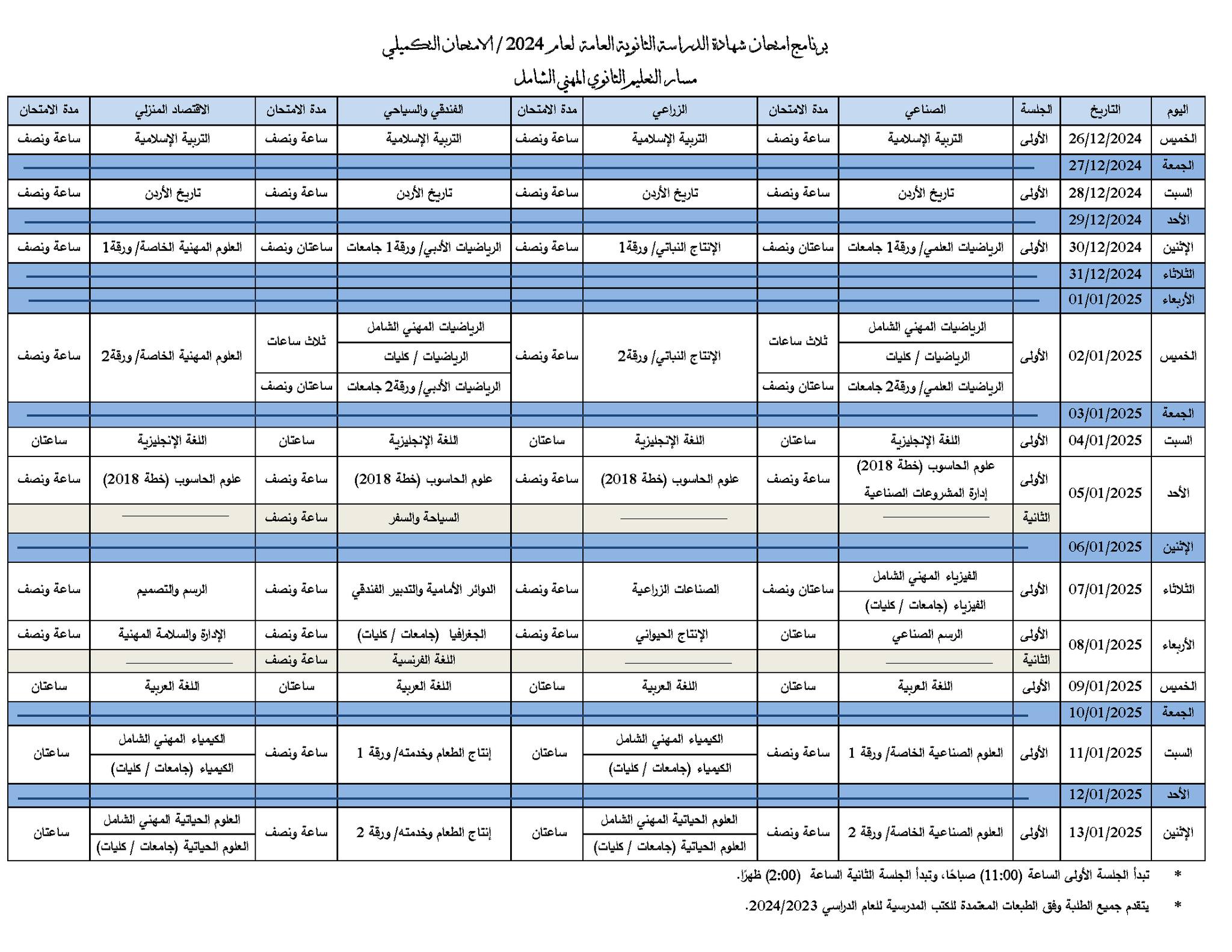 وبحسب الوزارة سيكون أول أيام الامتحان الخميس الموافق 26 كانون أول 2024، وآخر أيام الامتحان الاثنين الموافق 13 كانون ثانٍ 2025 في حين تبدأ الجلسة الأولى في تمام الساعة الحادية عشرة صباحًا كما وستبدأ الجلسة الثانية في تمام الساعة الثانية ظهرًا.