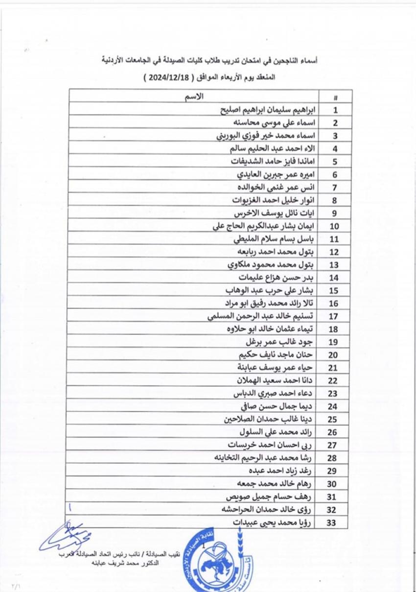 أحداث اليوم - أعلنت نقابة الصيادلة، أسماء الناجحين في امتحان تدريب طلاب كليات الصيدلة في الجامعات الأردنية المنعقد يوم الأربعاء الموافق 18/12/2024.وتاليا الأسماء: