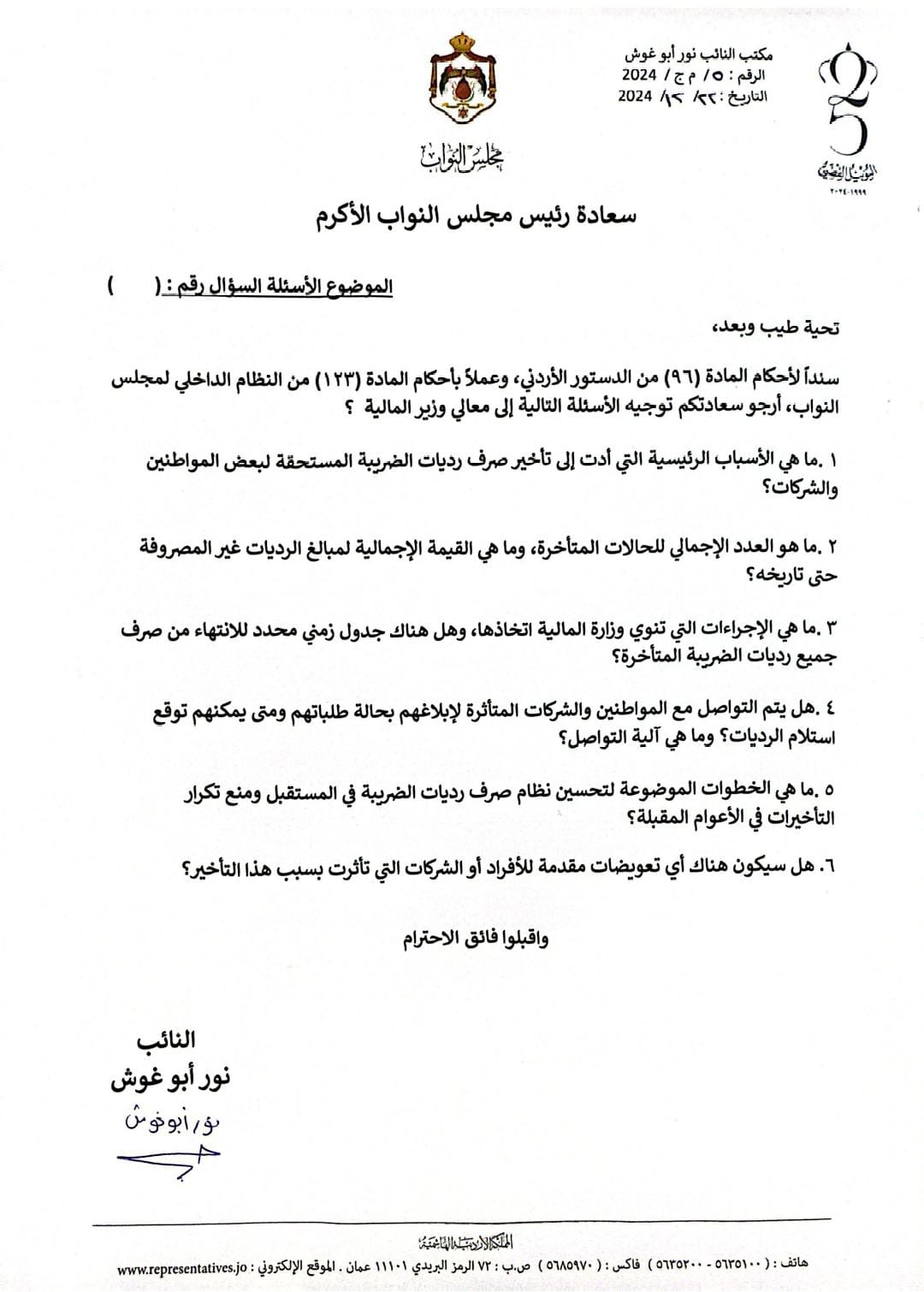 وجهت النائب نور أبو غوش سؤالًا إلى وزير المالية للاستفسار عن أسباب تأخير صرف رديات الضريبة المستحقة للمواطنين والشركات، والعدد الإجمالي للحالات المتأخرة، والإجراءات التي تنوي الوزارة اتخاذها لمعالجة هذا الملف.