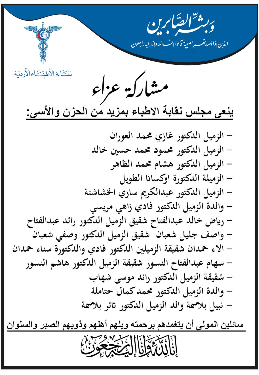 أحداث اليوم - نعت نقابة الأطباء خمسة أطباء اردنيين الذين انتقلوا إلى رحمة الله تعالى خلال الأيام الماضية.