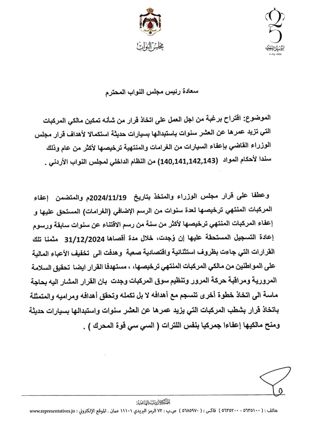 وعطفا على قرار مجلس الوزراء والمتخذ بتاريخ 19/11/2024م والمتضمن إعفاء المركبات المنتهي ترخيصها لعدة سنوات من الرسم الإضافي (الغرامات) المستحق عليها و إعفاء المركبات المنتهي ترخيصها لأكثر من سنة من رسم الاقتناء عن سنوات سابقة ورسوم إعادة التسجيل المستحقة عليها إن وُجدت، خلال مدة أقصاها 31/12/2024 مثمنا تلك القرارات التي جاءت بظروف استثنائية واقتصادية صعبة وهدفت الى تخفيف الأعباء المالية على المواطنين من مالكي المركبات المنتهي ترخيصها، مستهدفا القرار أيضا تحقيق السلامة المرورية ومراقبة حركة المرور وتنظيم سوق المركبات وجدت بإن القرار المشار اليه بحاجة ماسة اإلى اتخاذ خطوة أخرى تنسجم مع أهدافه لا بل تكمله وتحقق أهدافه ومراميه والمتمثلة باتخاذ قرار بشطب المركبات التي يزيد عمرها عن العشر سنوات واستبدالها بسيارات حديثة ومنح مالكيها إعفاءا جمركيا بنفس اللترات ( السي سي قوة المحرك ) .