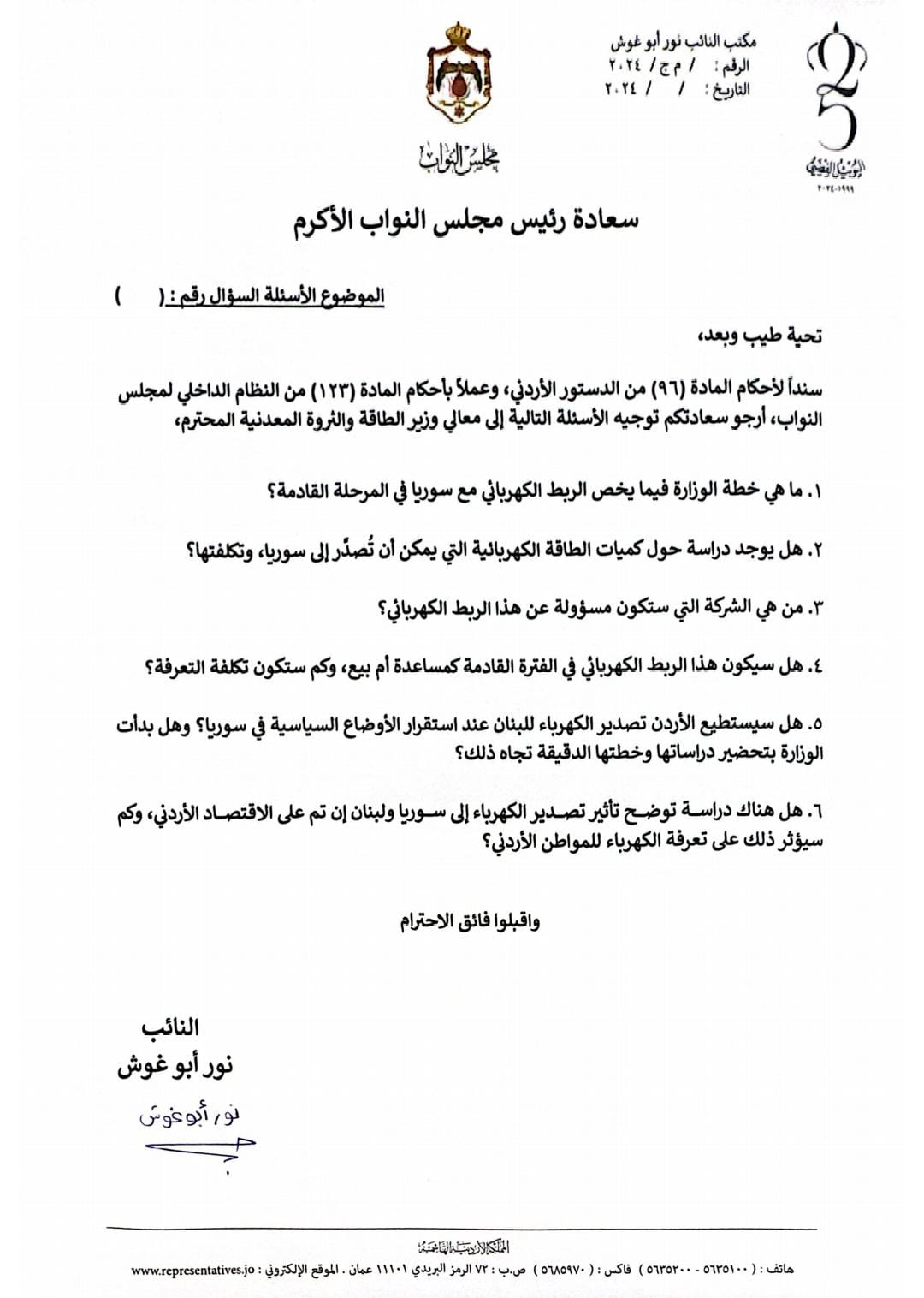 أبو غوش توجه سؤالاً نيابياً لوزير الطاقة عن الربط الكهربائي مع سوريا