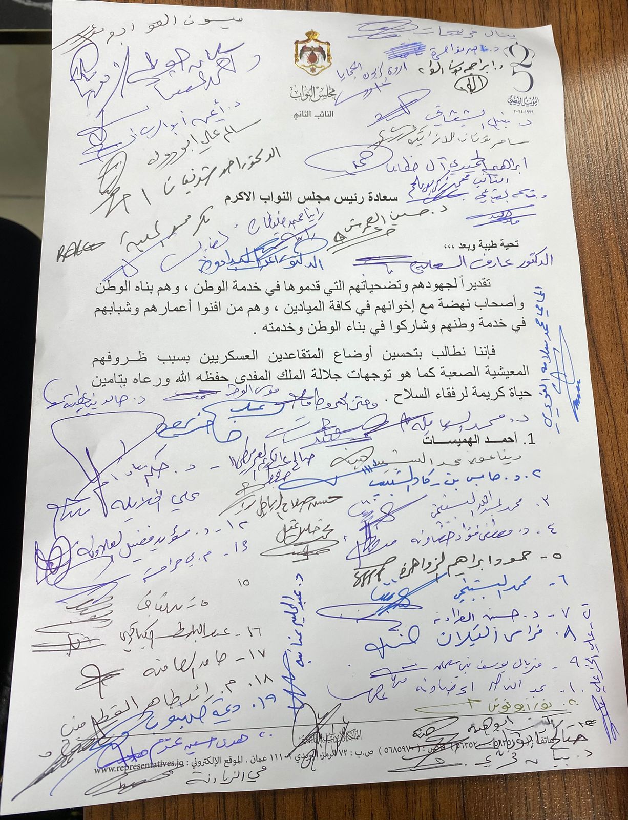 تبنى النائب احمد الهميسات مذكرة نيابية لتحسين أوضاع المتقاعدين العسكريين مبرراً في ذلك انها تقديراً لجهودهم وتضحياتهم التي قدموها في خدمة الوطن.