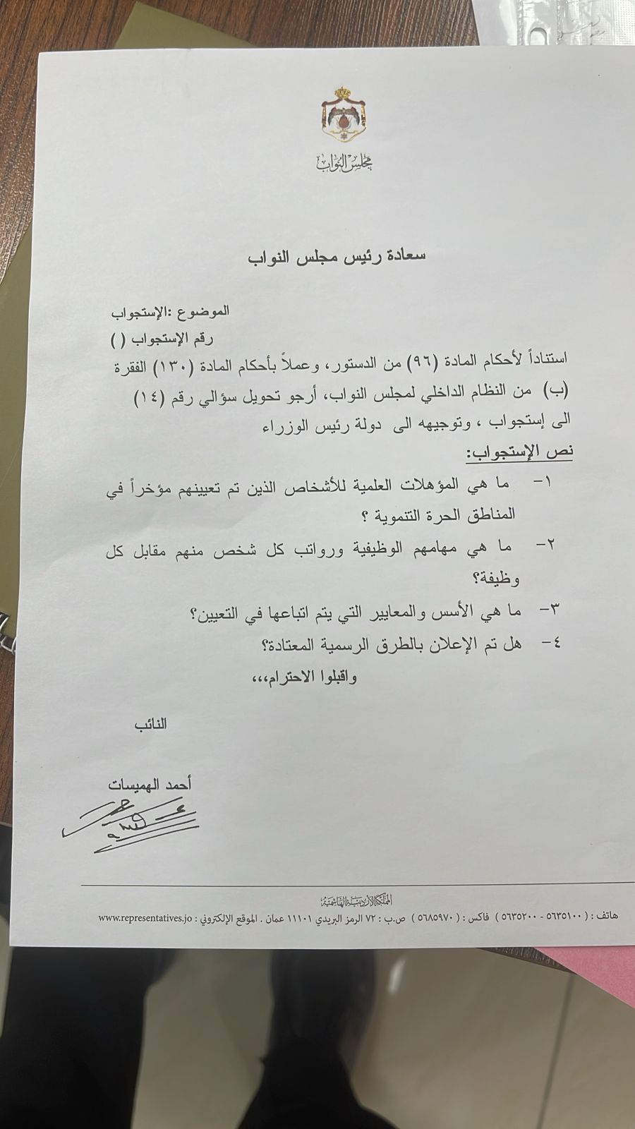 الهميسات يستجوب الحكومة حول تعيين أشخاص مؤخراً في المناطق الحرة التنموية
