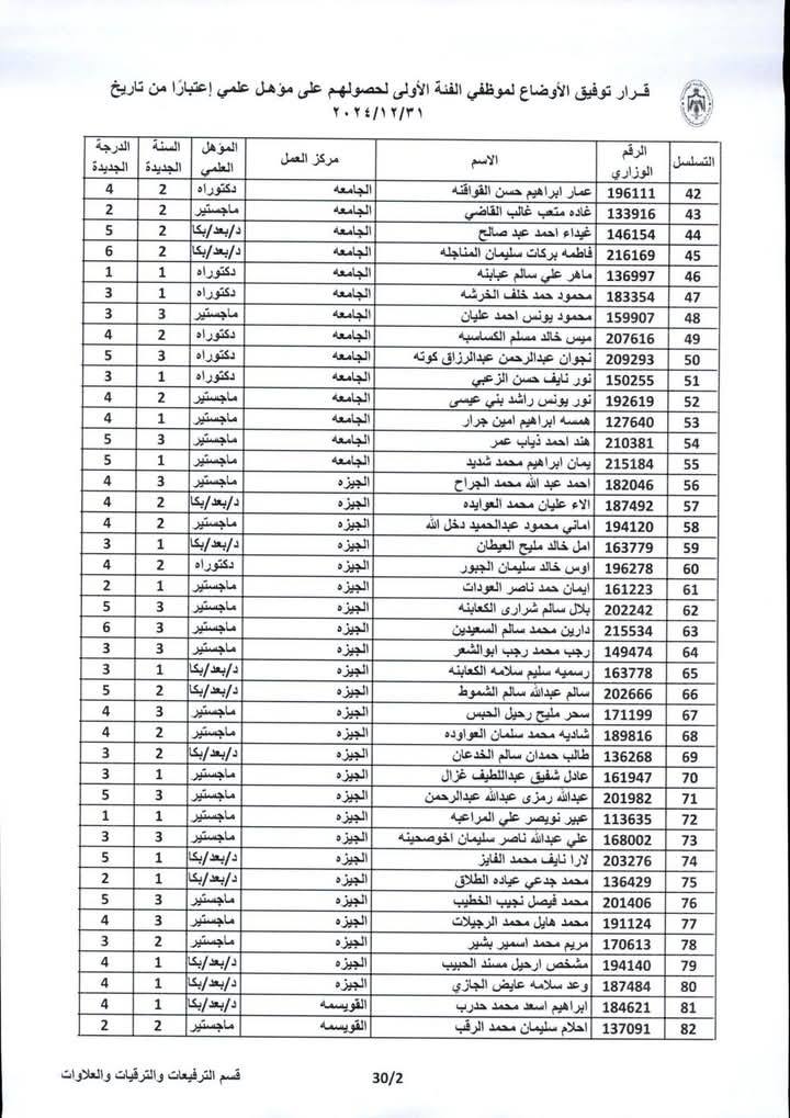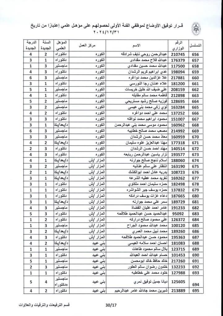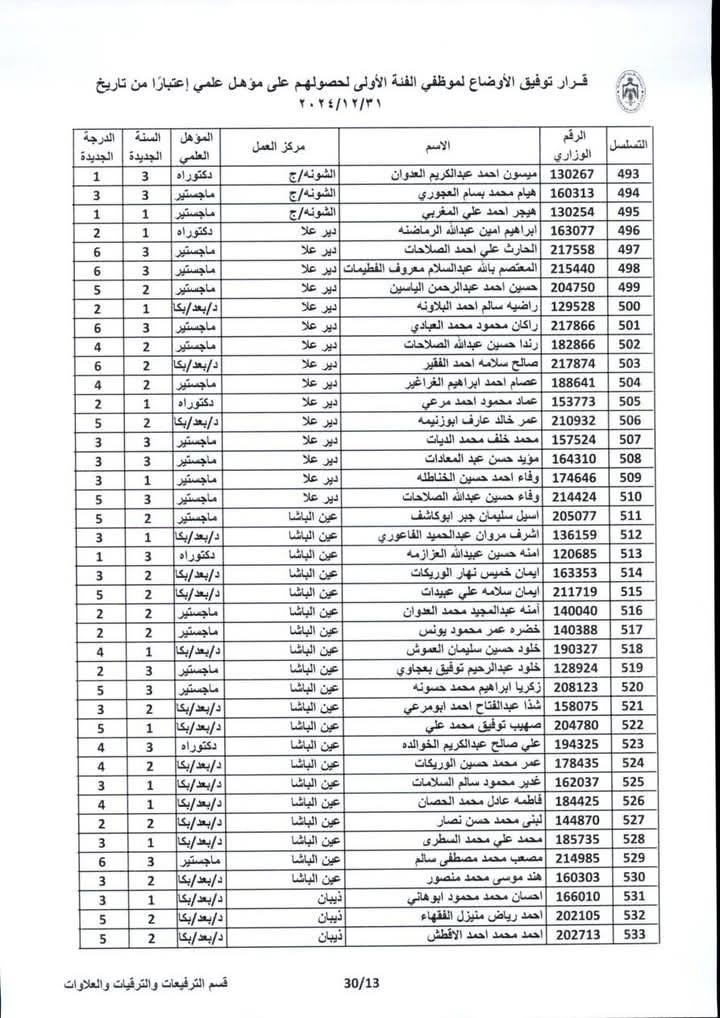 أحداث اليوم - قرر وزير التربية والتعليم الدكتور عزمي محافظة، الموافقة على توفيق أوضاع 1220 موظفا الى راتب السنة والدرجة من الفئة الاولى المبينتين إزاء اسم كل منهم في ضوء حصولهم على مؤهل الدبلوم العالي أو الماجستير او الدكتوراة وذلك ابتداءا من تارسخ 13/12/2024 :